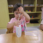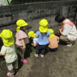 雨上がりに戸外に出られた時は、葉や遊具についた雫に興味を示したり、カタツムリや虫探しをしたり、水たまりで大胆に足踏みしたり・・・