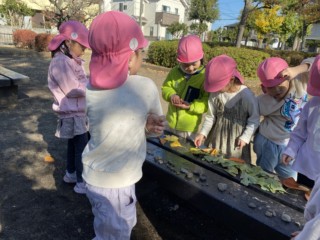 においをかいでみたり、葉脈や様々な色があることを発見したりと、自分たちの目でじっくりと観察しながら描き、色鮮やかな落ち葉が完成🍂