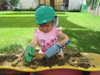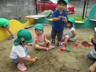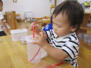 冷たい水に手を伸ばしたり、カップを使って水をすくったりと楽しんでいた子どもたちです!