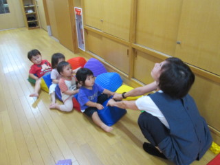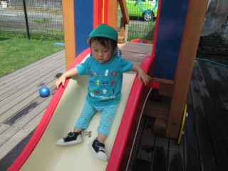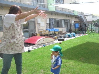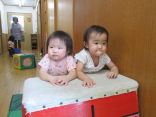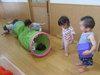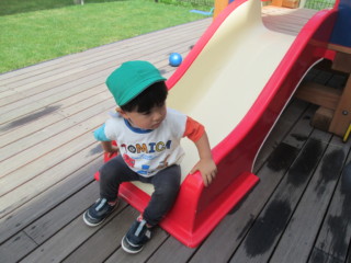 外が暑くて遊べない時は、部屋の前の廊下で体をたくさん動かして遊んでいます。