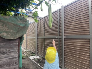 大きなヘチマを見つけてビックリ!触ってみるとザラザラした感触でした。