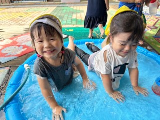 うさぎ組は日よけのあるウッドデッキで暑さ対策を行いながら、元気いっぱい水遊びを楽しんでいます♪