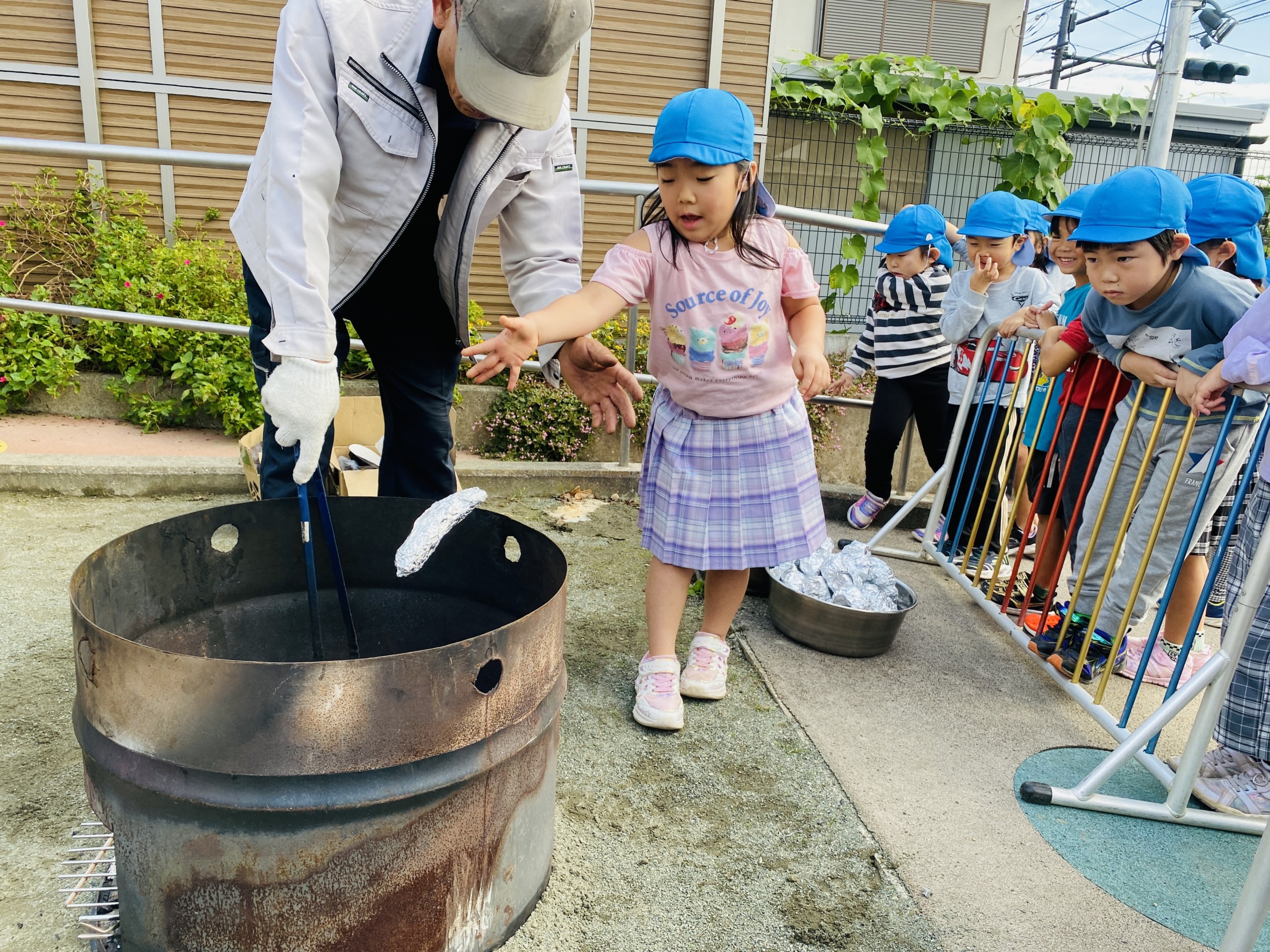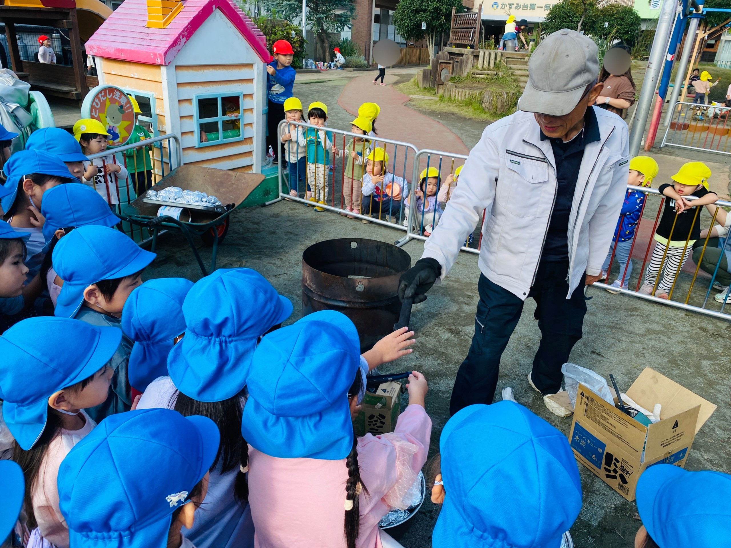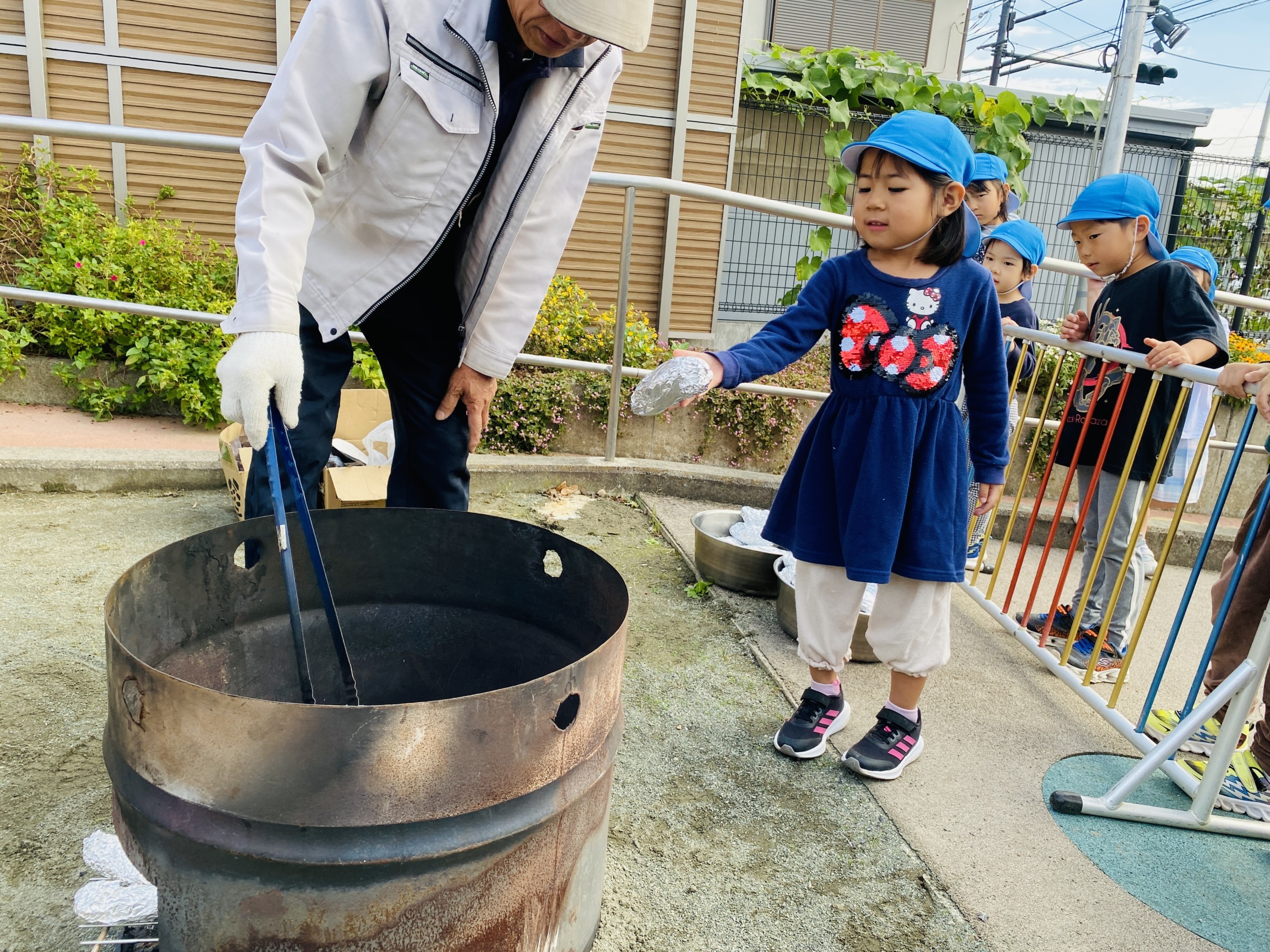 園庭では、用務員さんと熱々のドラム缶がみんなのことを待っていました🛢