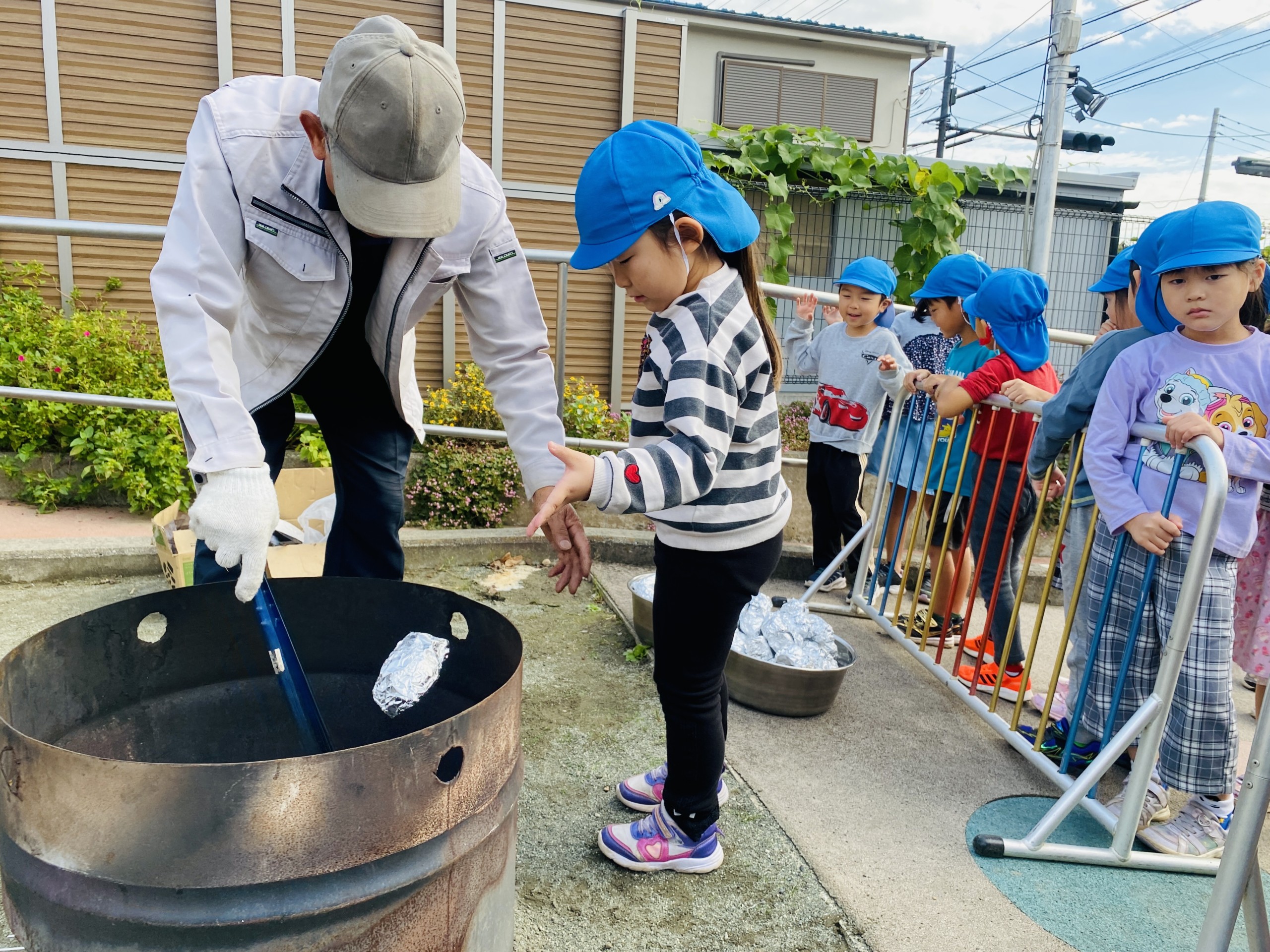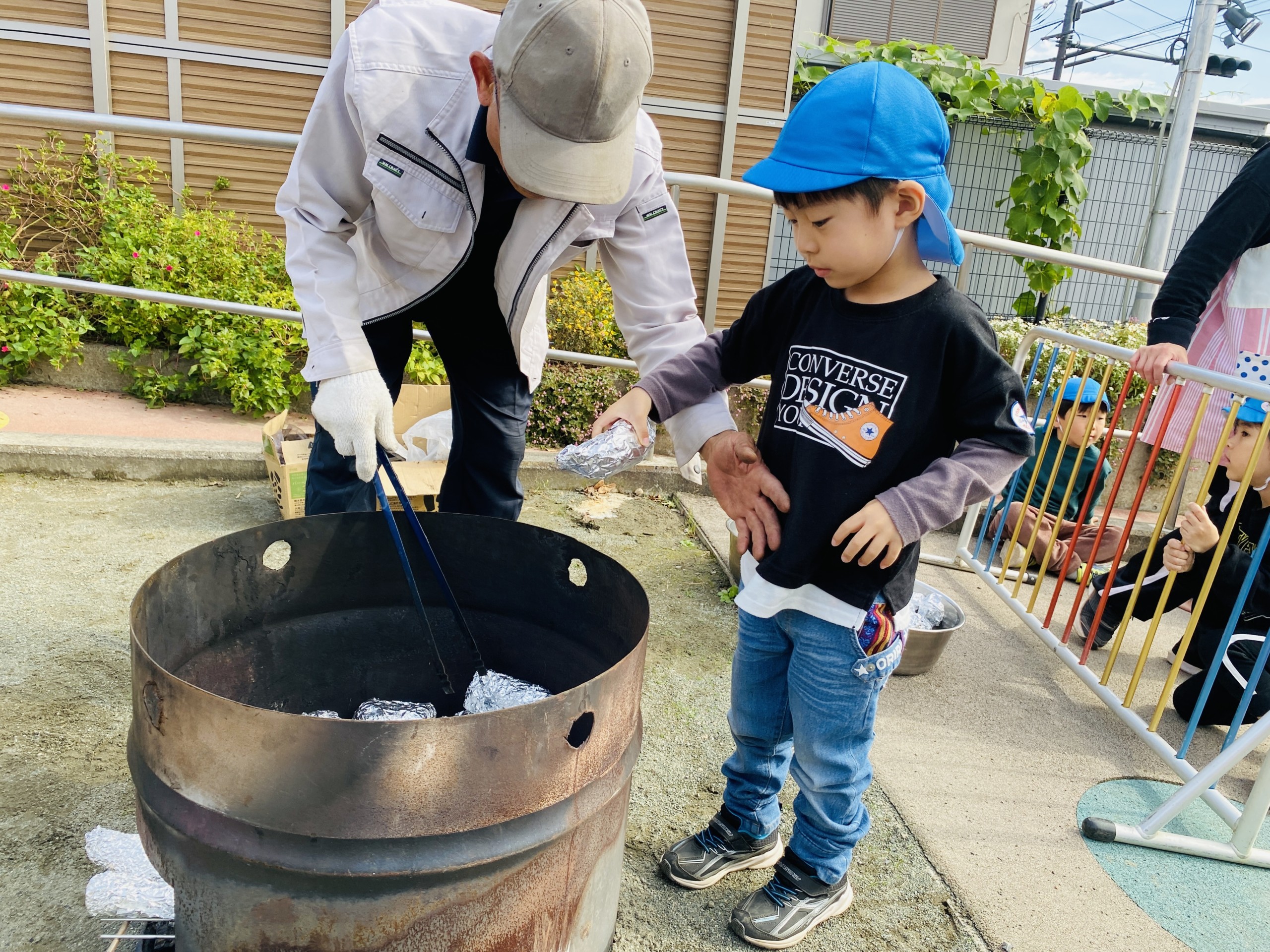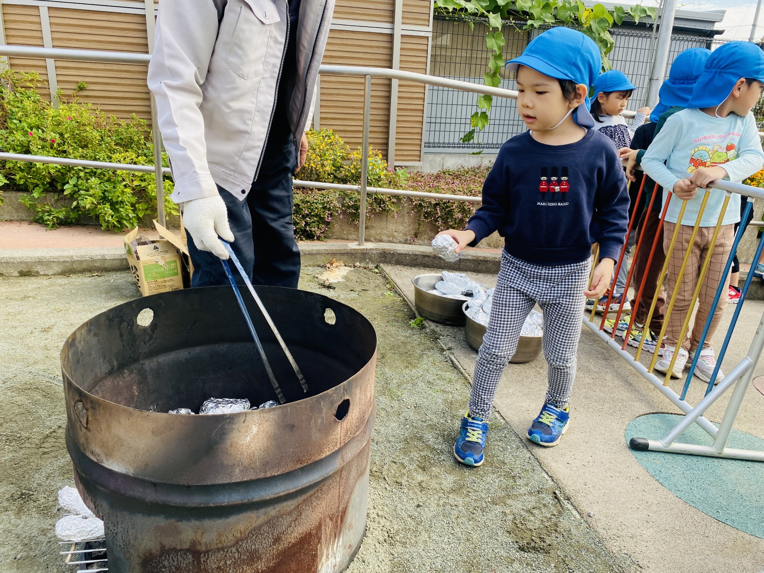 園庭では、用務員さんと熱々のドラム缶がみんなのことを待っていました🛢