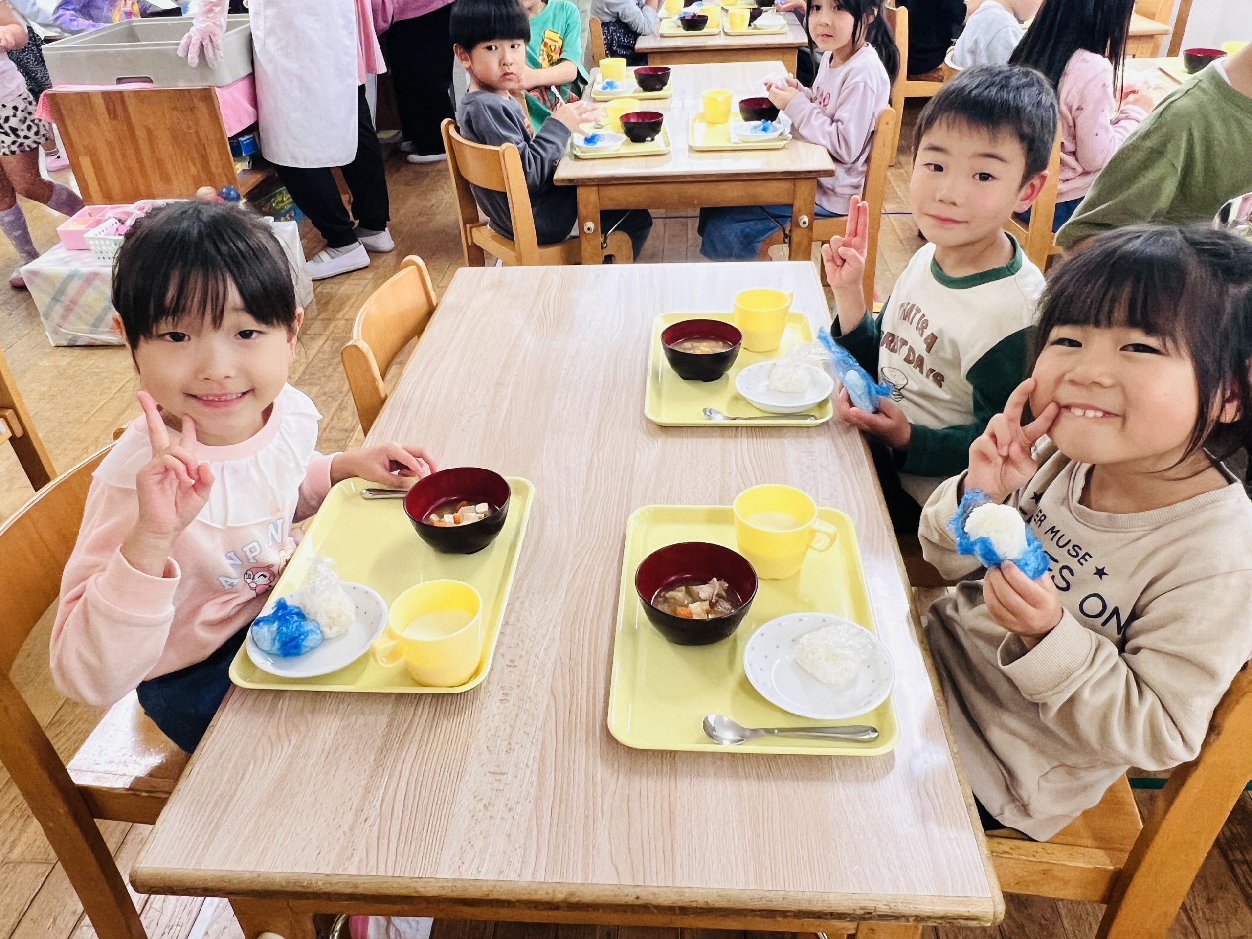 夏場の異常な暑さにより、今年度は不作でしたが、自分達で育てたお米と、きりん組の頃から天地返しを繰り返してきた味噌の芋煮を、おやつの時間にいただきました!