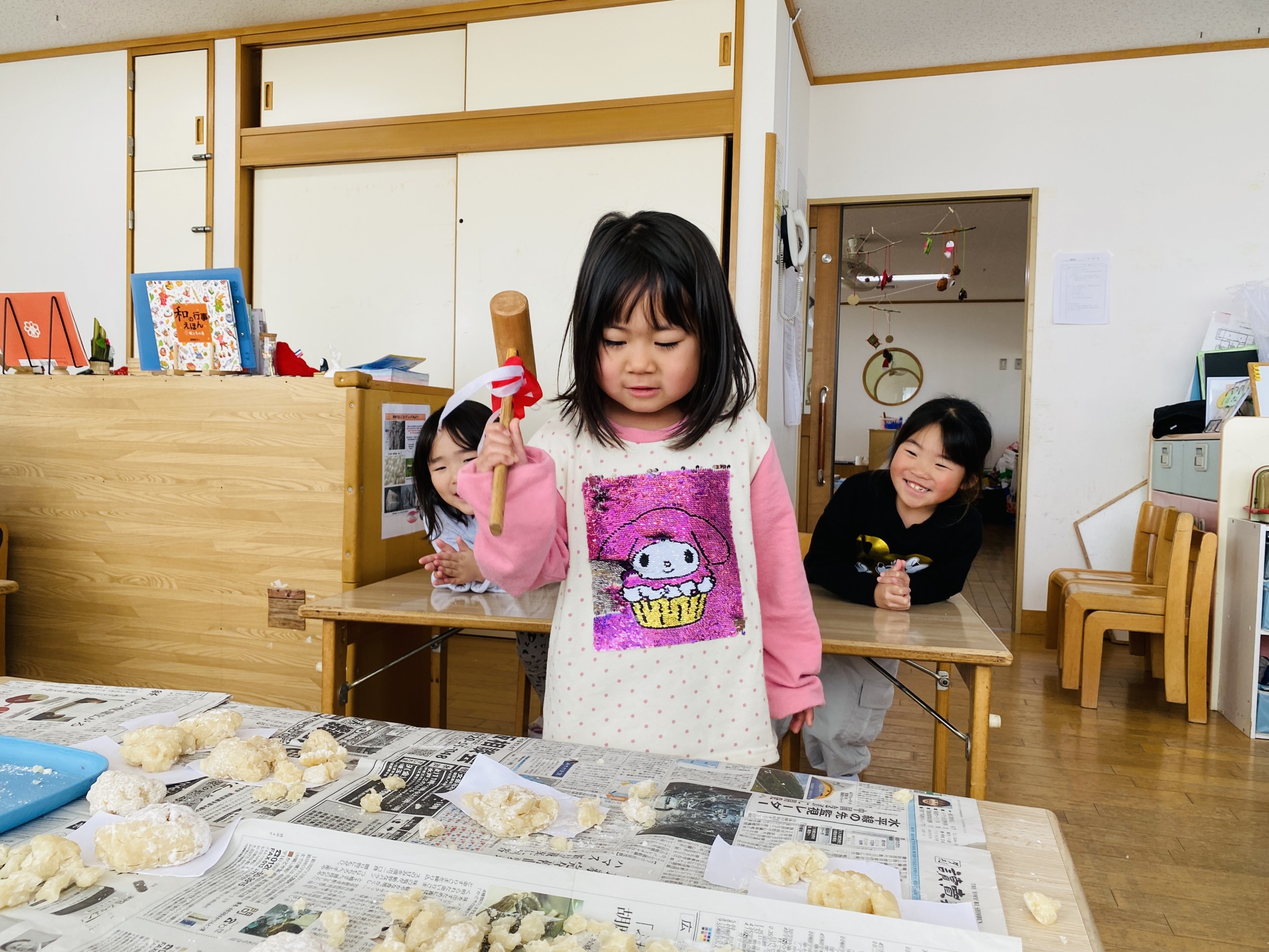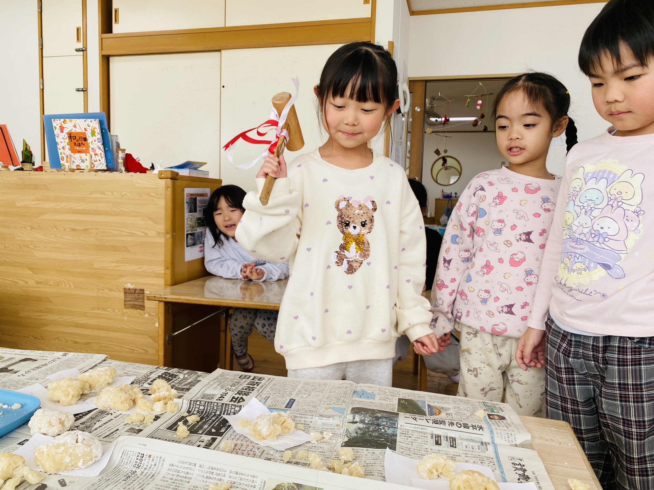 「もちつきの時ははあんなに柔らかかったのに…」と木槌で割れないほどの固さに驚きながらも、鏡餅めがけて一人ずつ割っていきました。