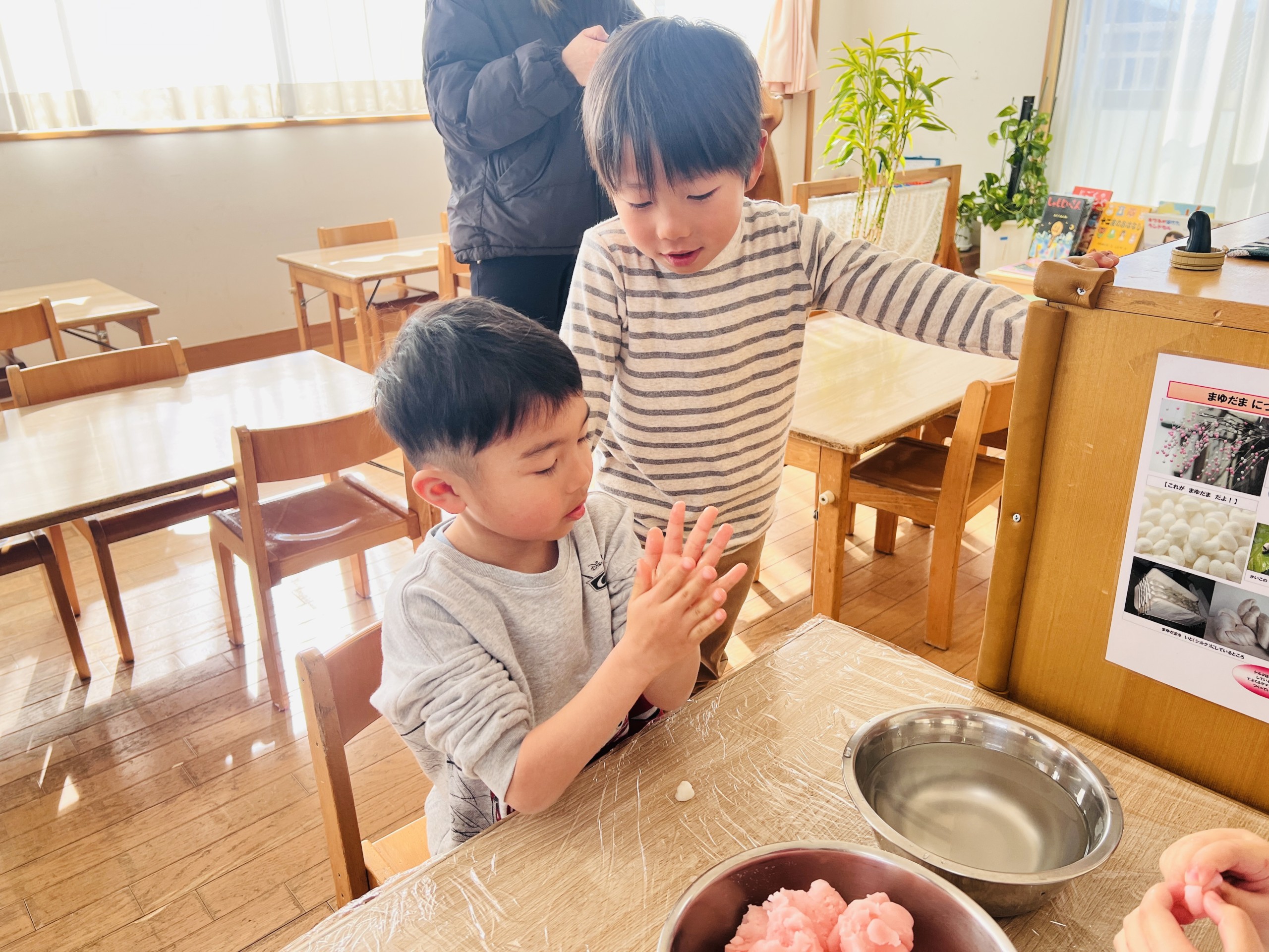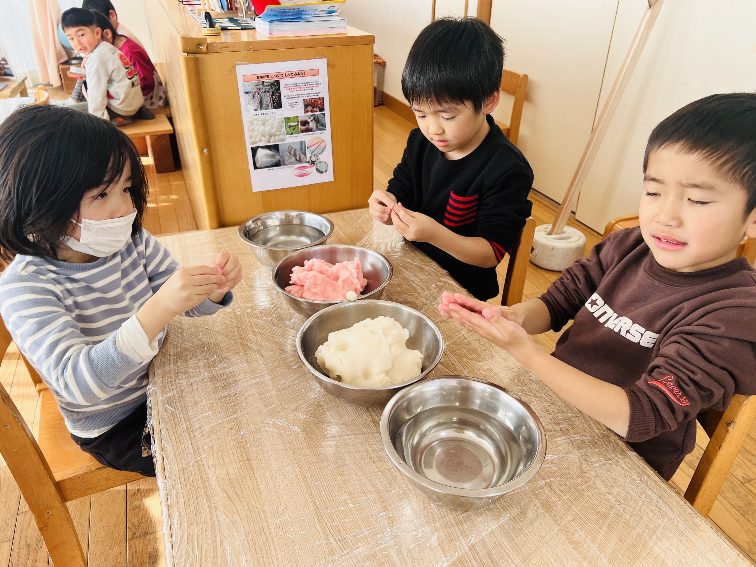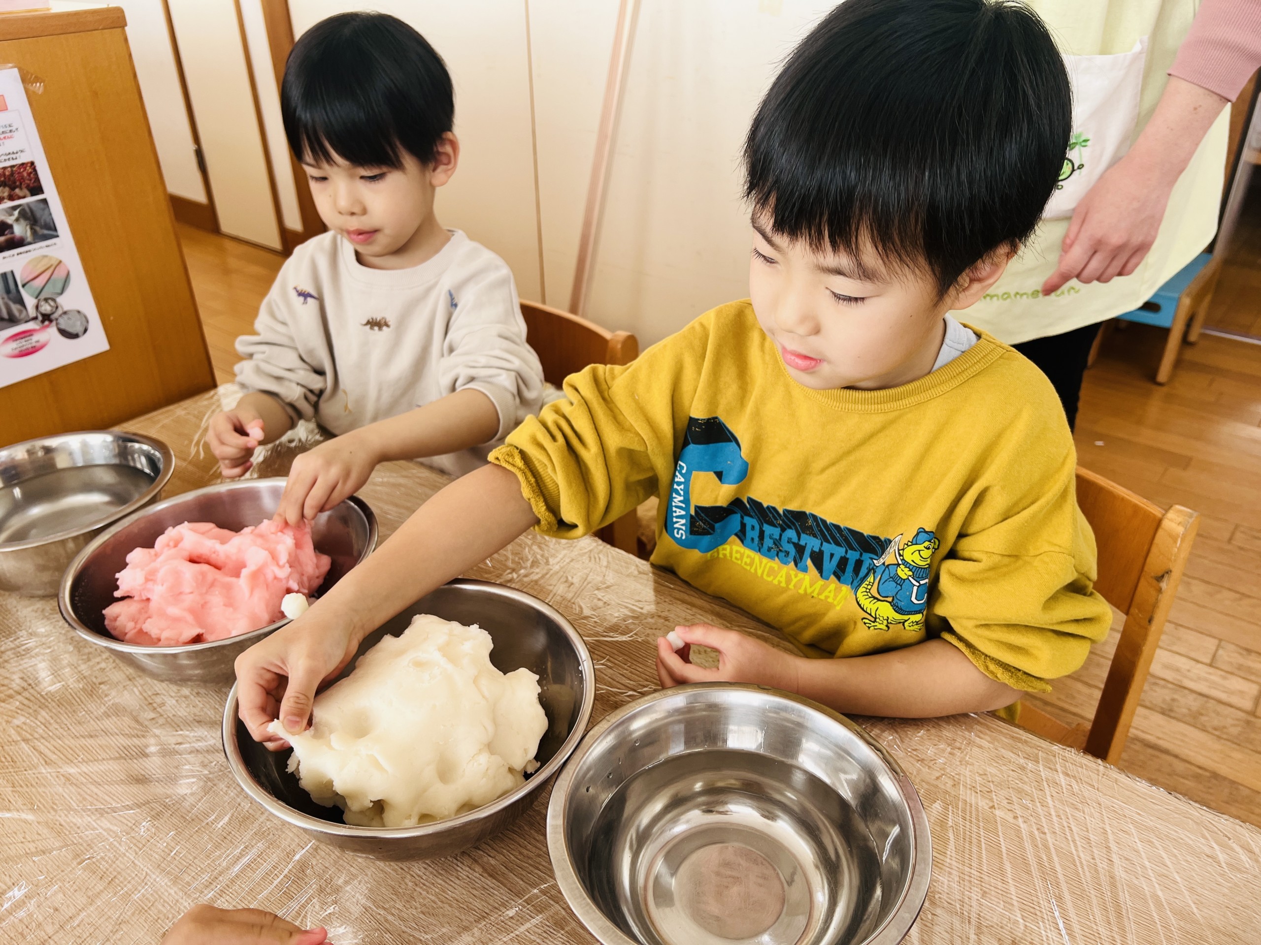 粉に水を加え、食紅で色を付けたりと、繭玉の材料を作るところから変化を楽しみました!
