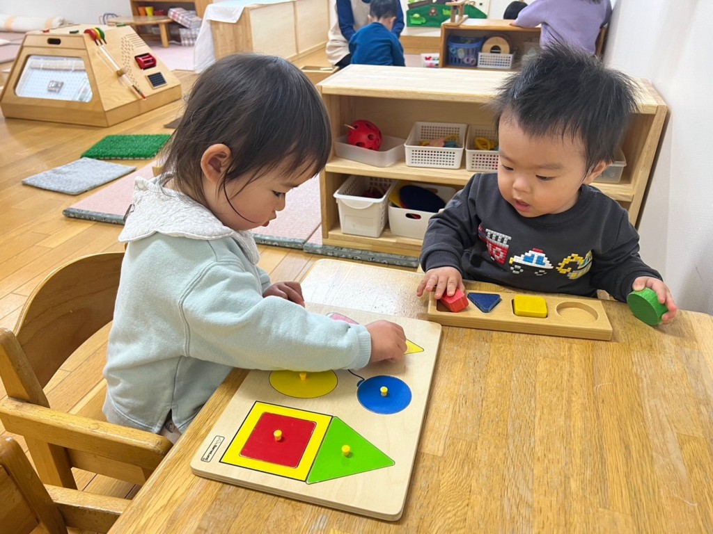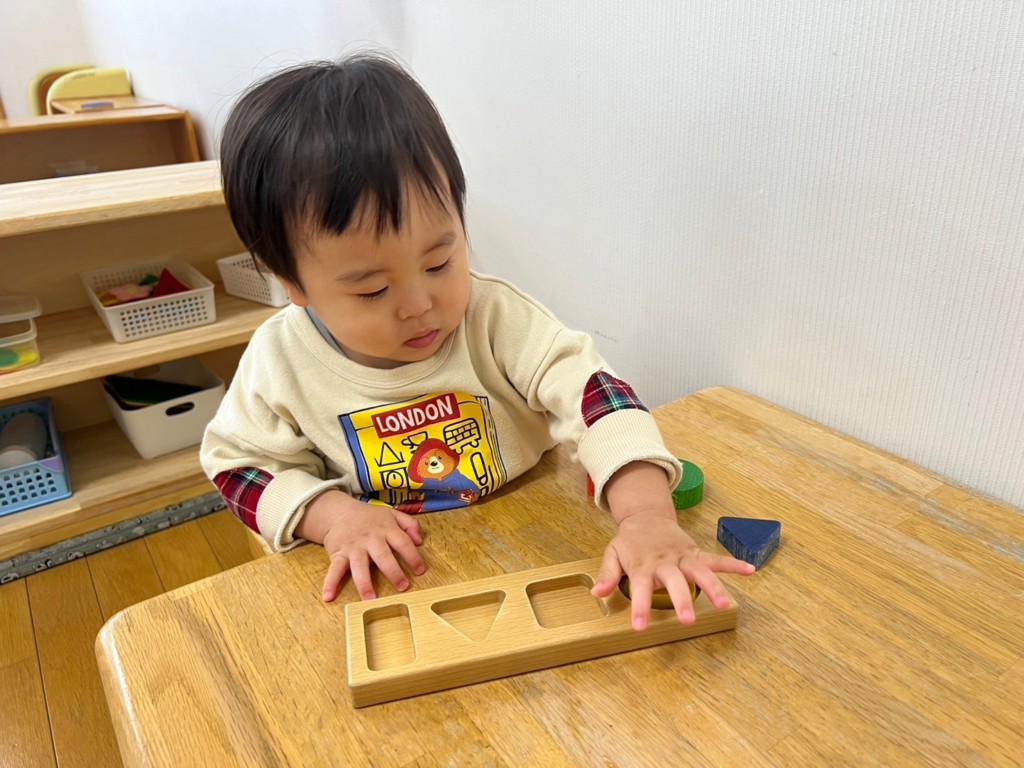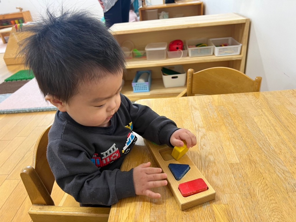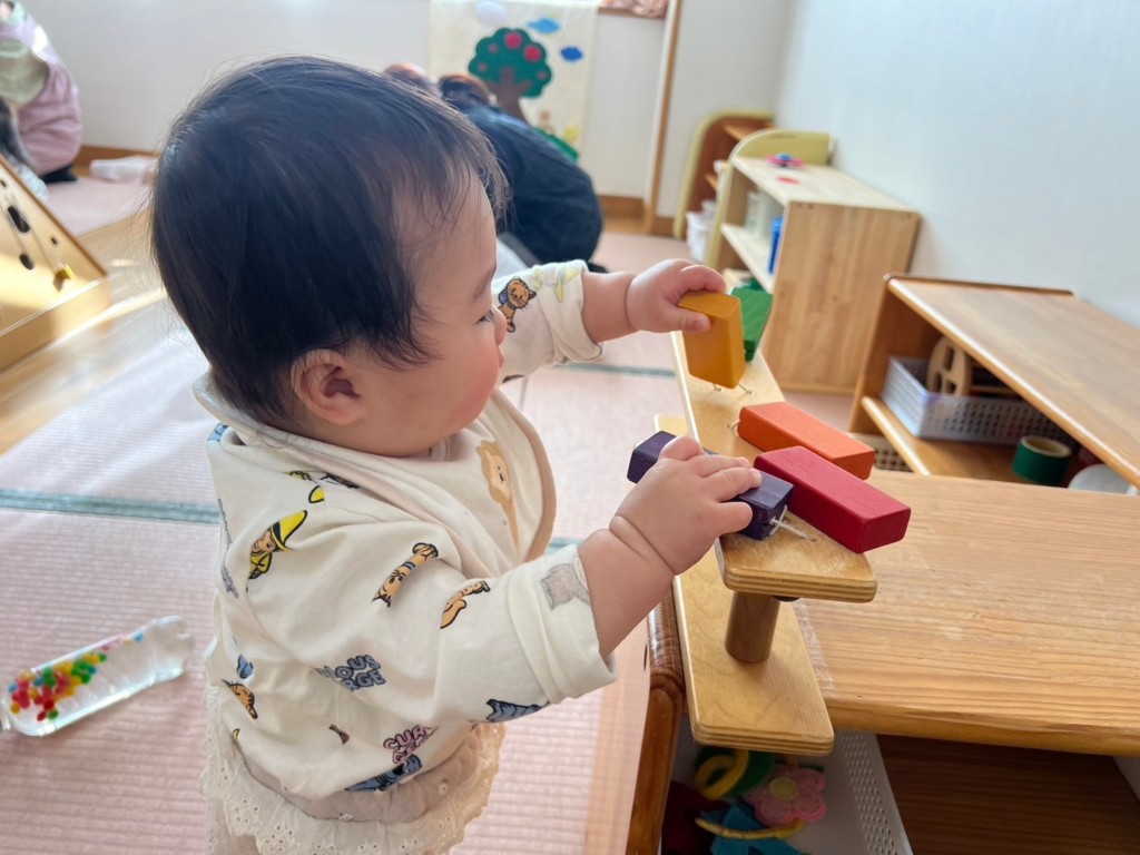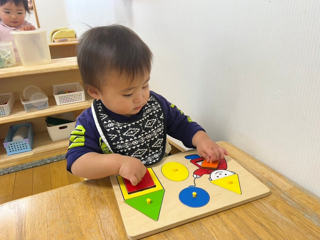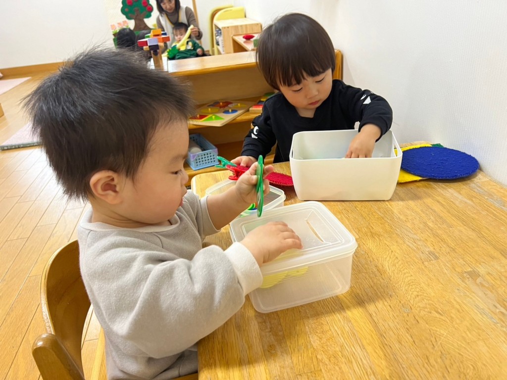 型はめパズルや紐通し、ぽっとん落としなど椅子に座ってあそぶことで、集中力が増し真剣な表情が見られます。