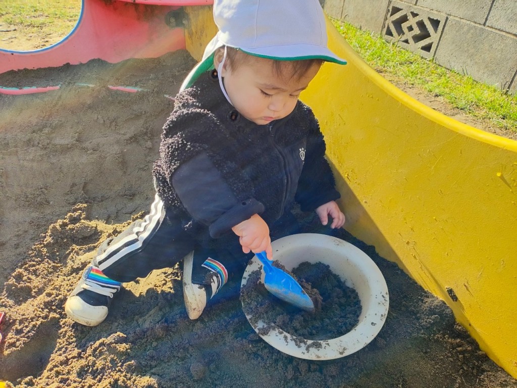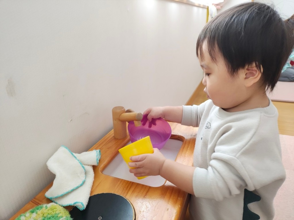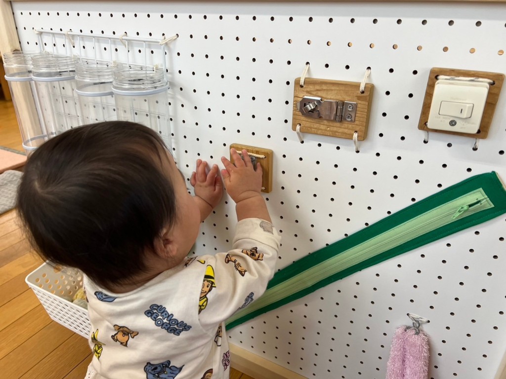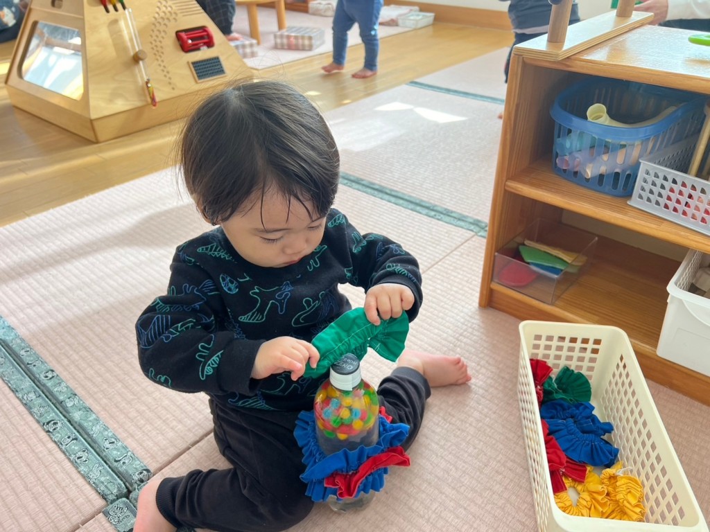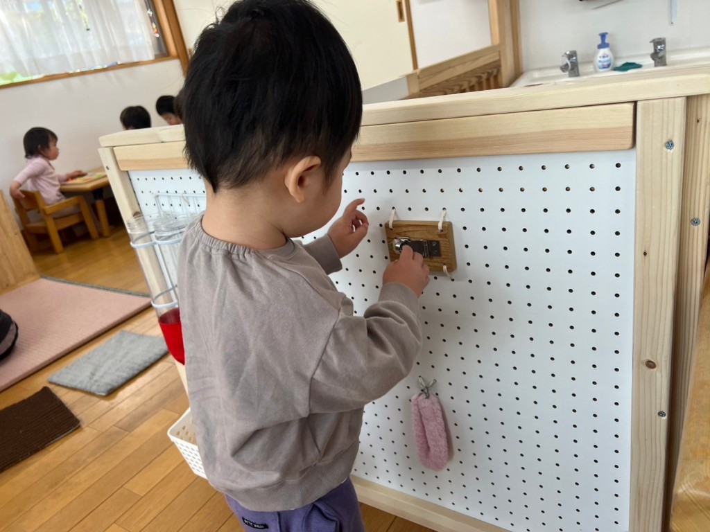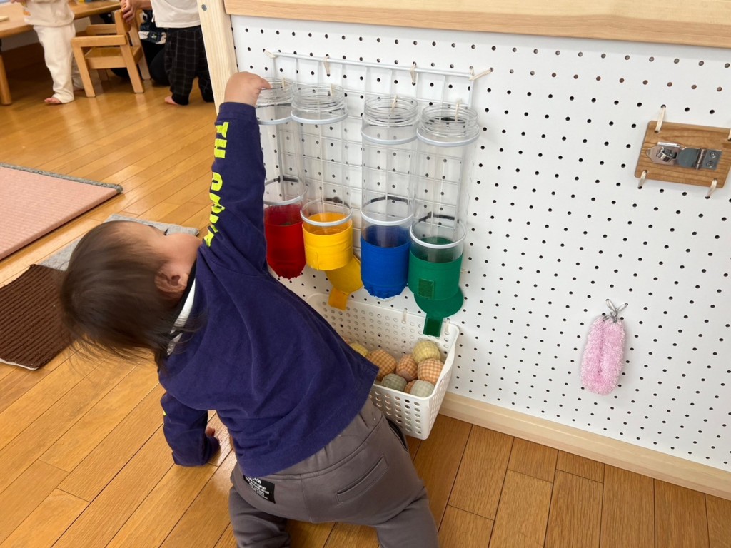 型はめパズルや紐通し、ぽっとん落としなど椅子に座ってあそぶことで、集中力が増し真剣な表情が見られます。