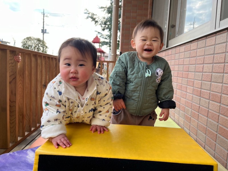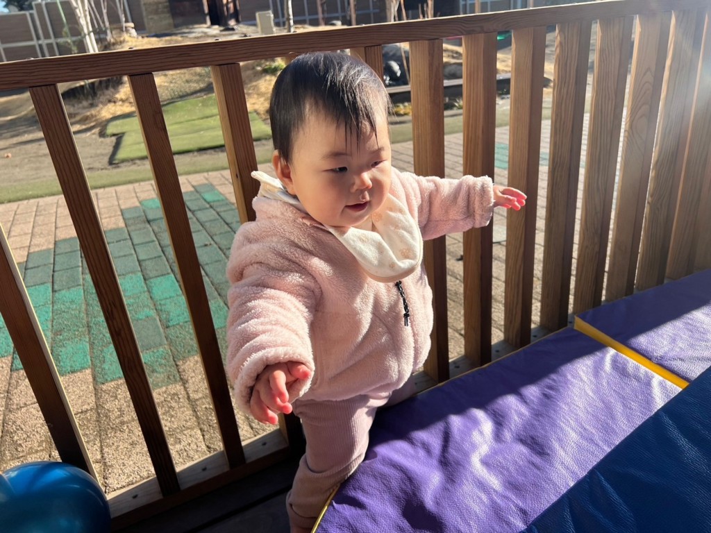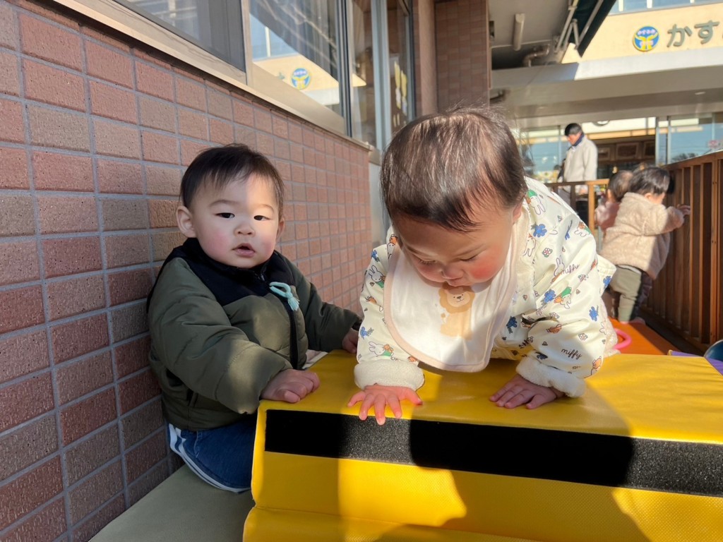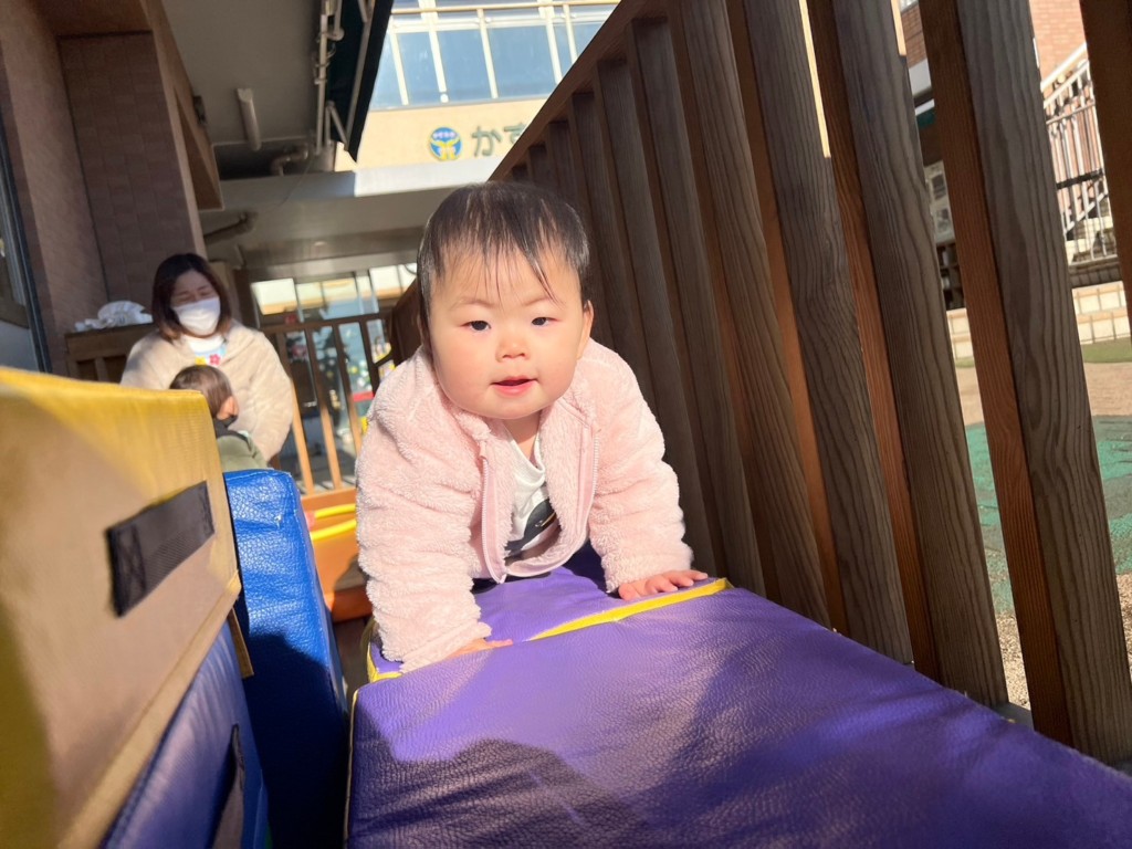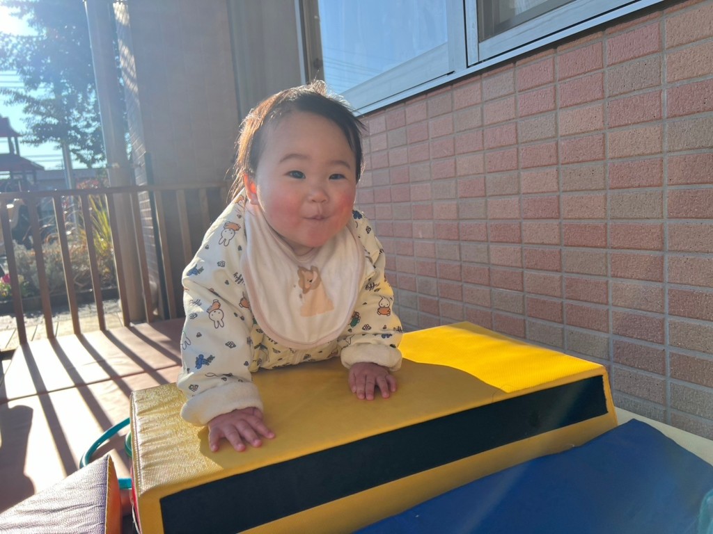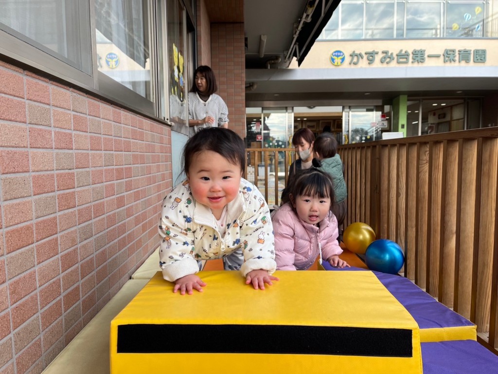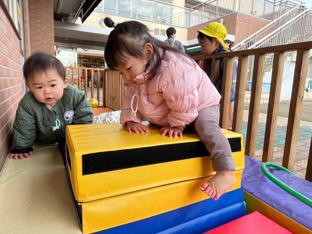 とびばこを3段にし高さが増しましたが、登り方、降り方を工夫し身体を動かしています。不安定なクッションの上でも一人で立とうとしたり伝い歩きをしたりと成長が感じられます。