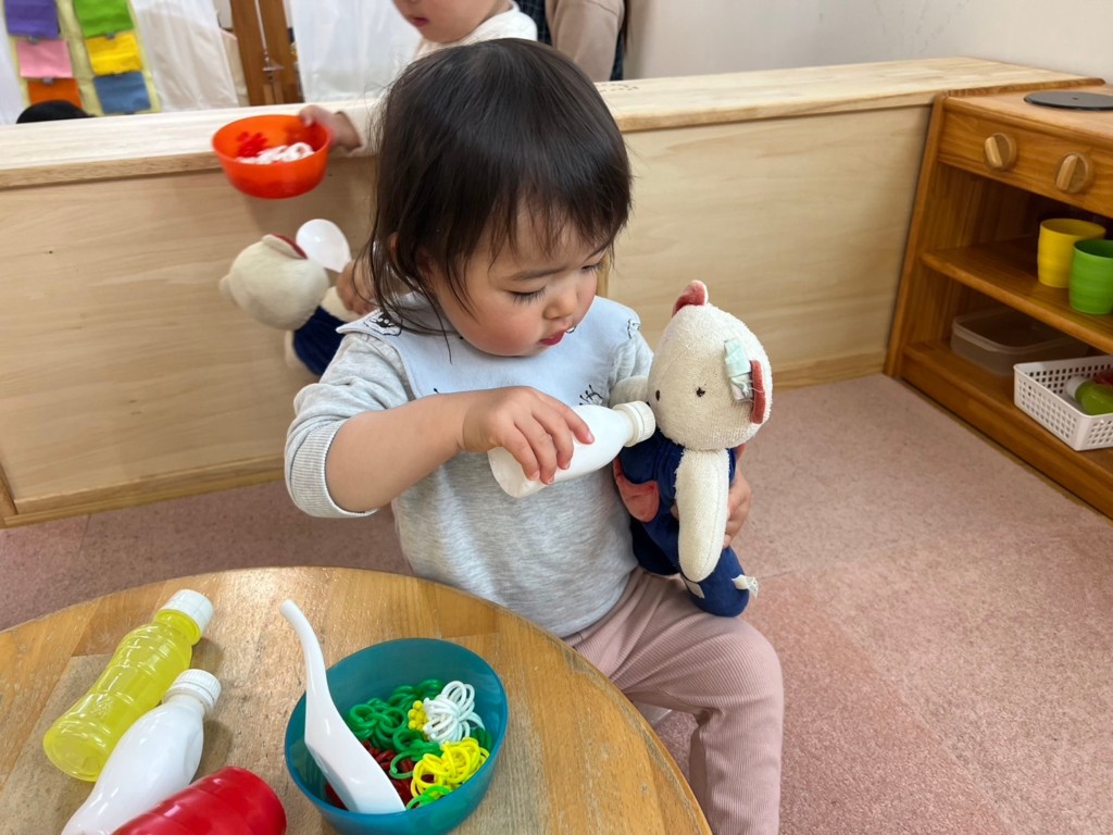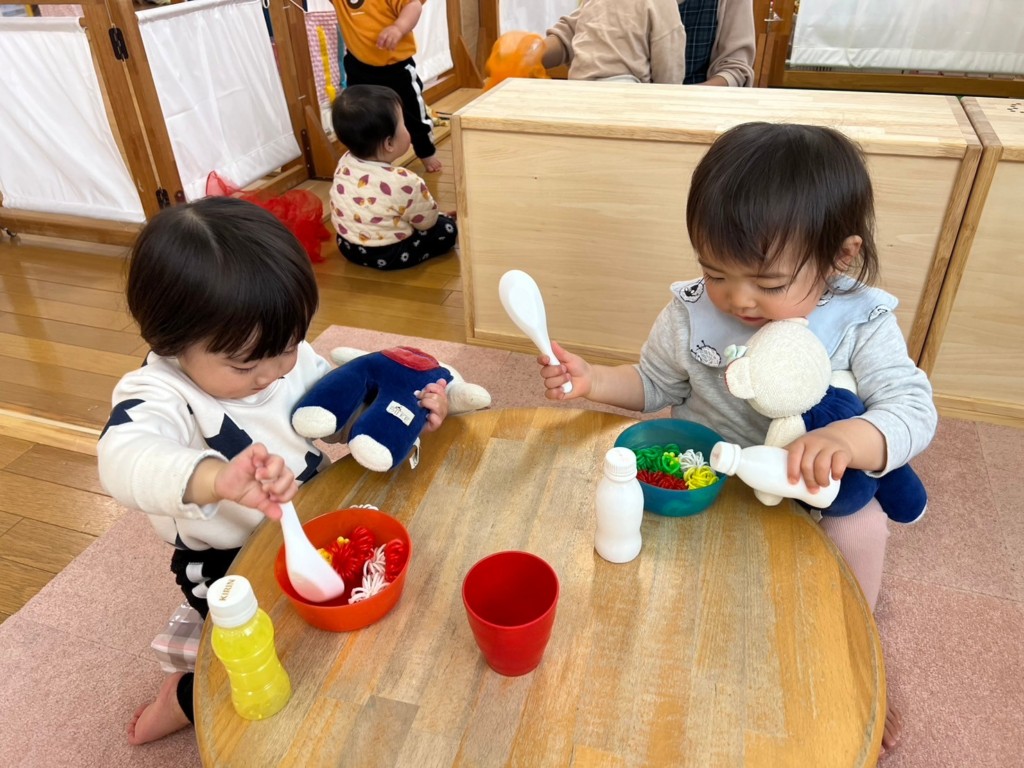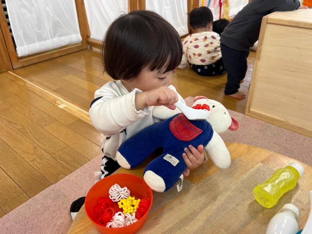 自分たちで食事をするあそびから、くまの人形(ぽーくん、きーちゃん)に食事をあげるスタイルへと変わってきました。