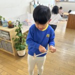 竹とんぼは最初、回転しても足元に落ちてしまうことが多かったのですが、何度かあそぶとコツをつかみ、数メートル先まで飛ばせるようになり喜ぶ姿が見られました。