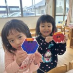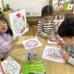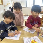 室内ではコマやだるま落とし、けん玉に触れたりしてあそびました。コマはプリズモで模様を作ったり、曼荼羅のぬり絵を塗ったものをコマにして、自分だけのコマを作って楽しんだりもしました✨