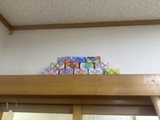 曼荼羅をきれいに塗って枡を、豆は紙をちぎって小さく丸めて作りました。
