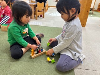 ・積み木やミニドールは子ども達の世界を表現しやすく、日々、動物園になったり、お城になったり、時には車になってドライブを楽しんでいます。
