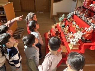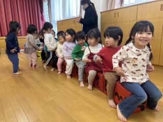 今回の音楽リズムは、積み木列車に乗ったり、ケンパー運動をしたり、和太鼓を叩いたりと・・・リズムの変化に合わせて体を動かして楽しみました。以前よりもリズムの違いに気付くのが早くなった子ども達は、気づいてない子に声を掛ける余裕さえ見えます。出来ることがどんどん増え、自信に満ち溢れている子ども達です。