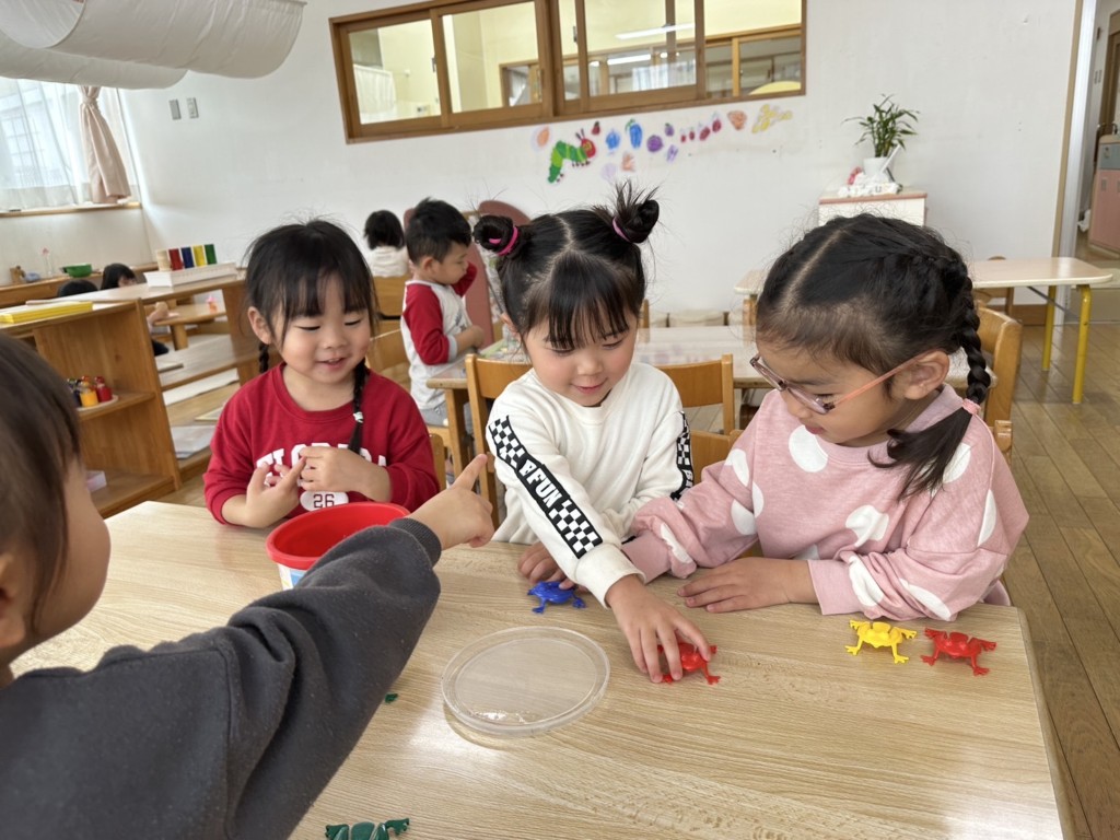 日々の集りの時間に「はらぺこあおむし」を読んでみんなで楽しんでます。子どもたちの耳になじむフレーズが多く「りんごをひとつ食べました~」「お腹はぺっこぺっこ」などと自分たちで絵本を見返したり、玩具などで再現してどんどん遊びが広がっています。保育士がちょっとだけ、きっかけを作ると「私も作りたい」と真似したり、より工夫して絵本の世界を楽しんでいる子どもたち。これから先、はらぺこあおむしはどうなっていくのか・・・今後も楽しみです。