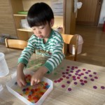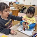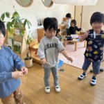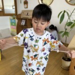 びゅんびゅんゴマに挑戦し毎日コツコツ励んでいる子どもたち。コツを掴み連続で回せるようになると、ビュンビュン音を響かせて、嬉しそうに友だちや保育者に見せています!