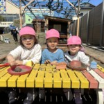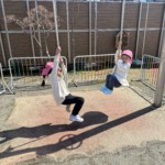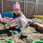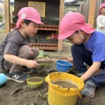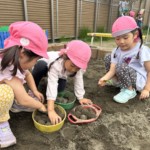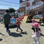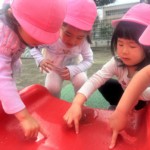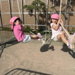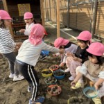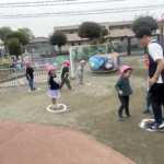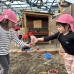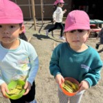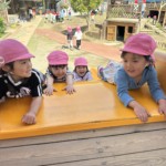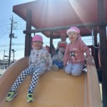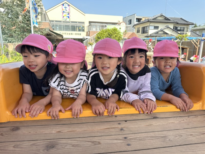 初々しいピンク帽子姿で園庭を駆け回ってあそんでいます。虫探しではだんごむしやアリ、てんとう虫を見つけ嬉しそうに見せてくれています。ターザンロープでは立ち乗りの挑戦が始まり、ロープがくねくねなるなかバランスをとって立ち上がれるよう頑張っています!