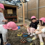 また落ち葉を集めお茶に見立てたり、桜の花びらを乗せて桜ケーキを作ったり、芝生の茎に落ち葉を通して飾りを作ったり…自然のものをあそびに取り入れて工夫してあそぶ姿に成長を感じています。
