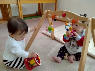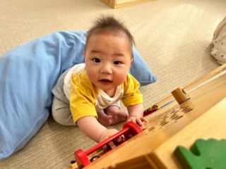 室内では、寝返りをする子、ずり這いやはいはいをする子、つかまり立ちをする子と、発育に応じてそれぞれのお子さんがいますが、一人ひとりが遊びを楽しめるよう環境を整えています。