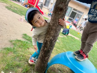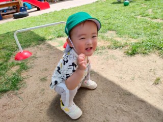 芝生広場ではバケツやシャベルを持ち夢中になって虫探しをする子どもたち。「ダンゴムシどこかな?」「アリどこかな?」と探し回っています。ダンゴムシやアリを見つけると「いたよ。」と大きな声で教えてくれます。中には自分の手にダンゴムシをのせて見せてくる子もいます。自然を感じながら戸外に出て元気いっぱい戸外遊びを楽しんでいます。