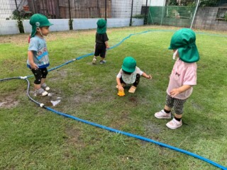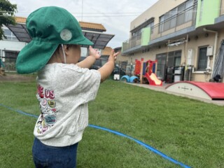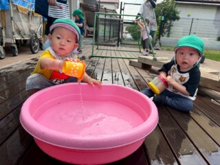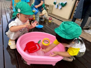 保育士や友達と水のかけ合いやジョウロなどの玩具を使って楽しんでいます。