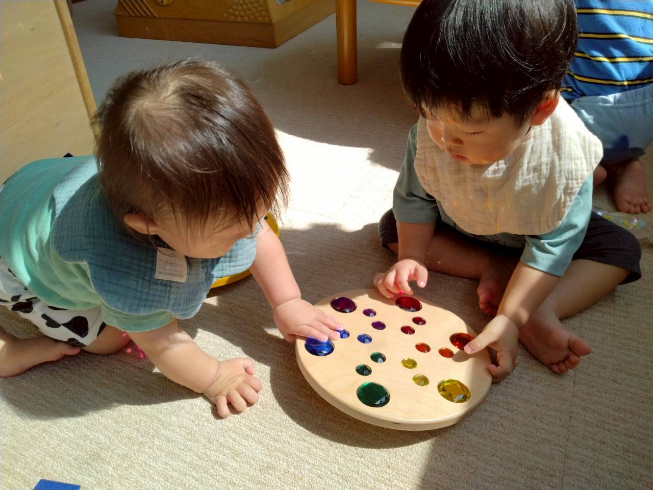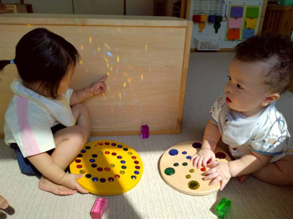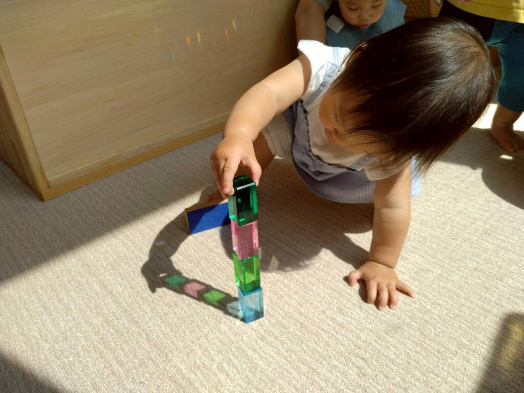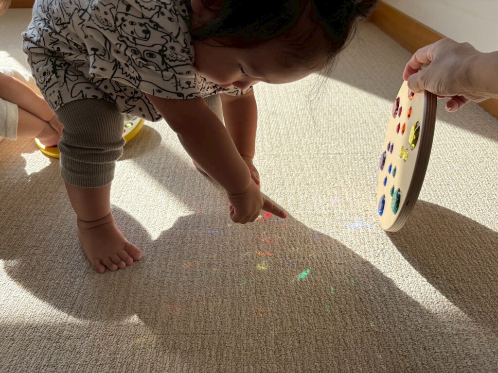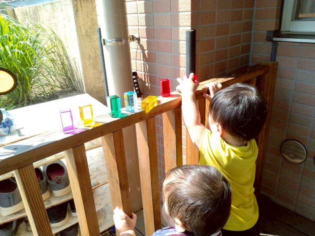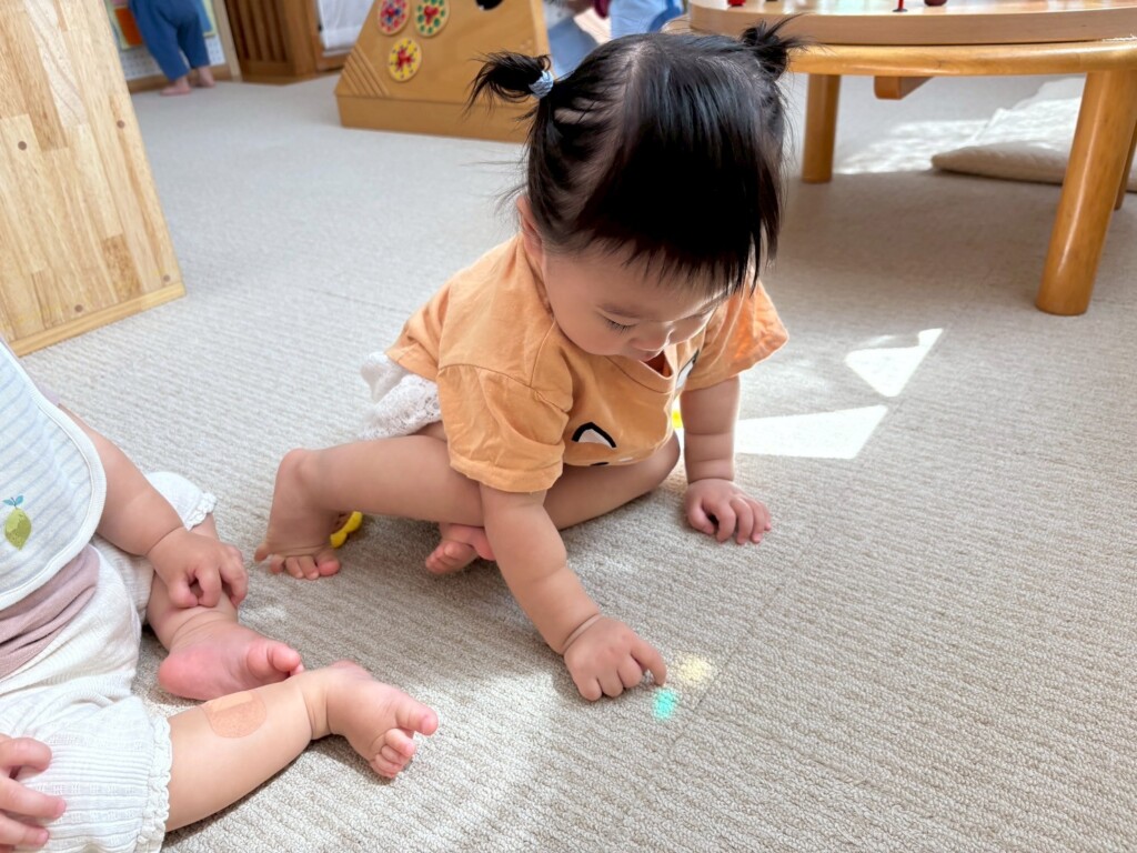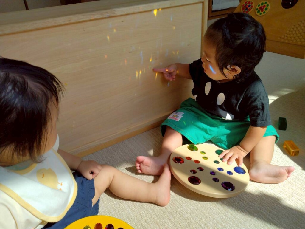 室内遊びでも窓から入る日差しの明るさに気づき、指を差して友達や保育士に教えたり、「なんだ?」と不思議がったりしています。ジュエル積み木やジュエルこまの輝き、床や壁、天井に映るカラフルな影や光にも気づいて興味津々の子ども達です。