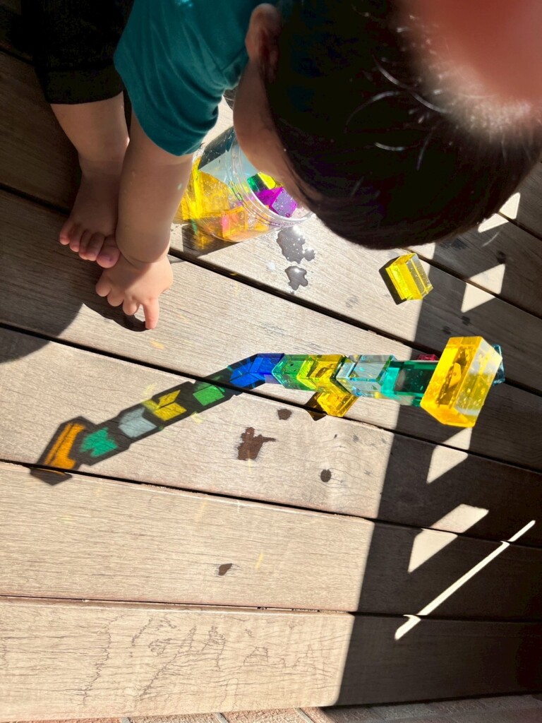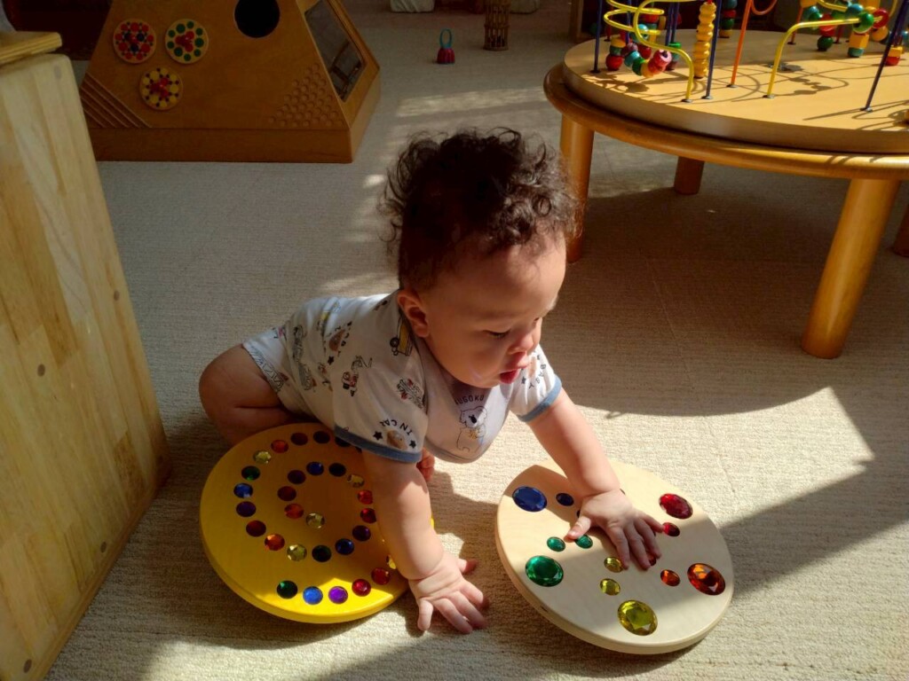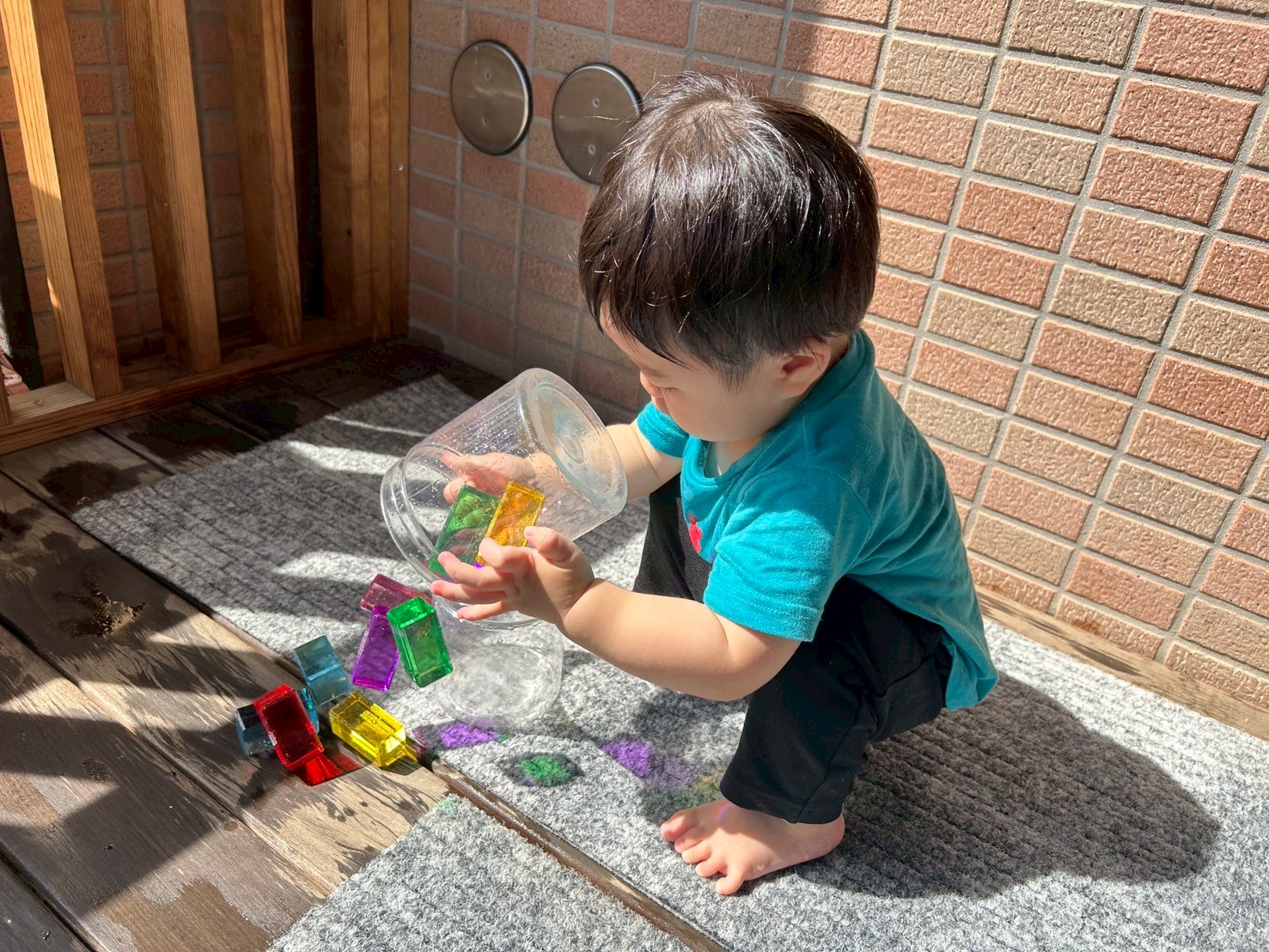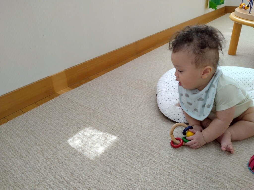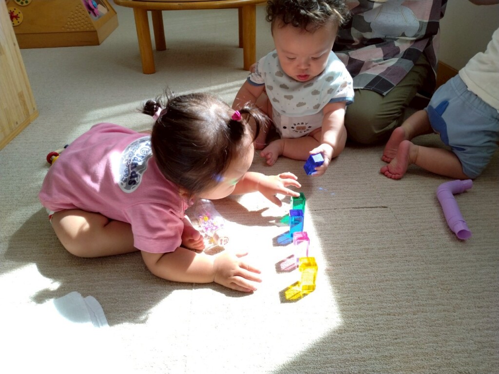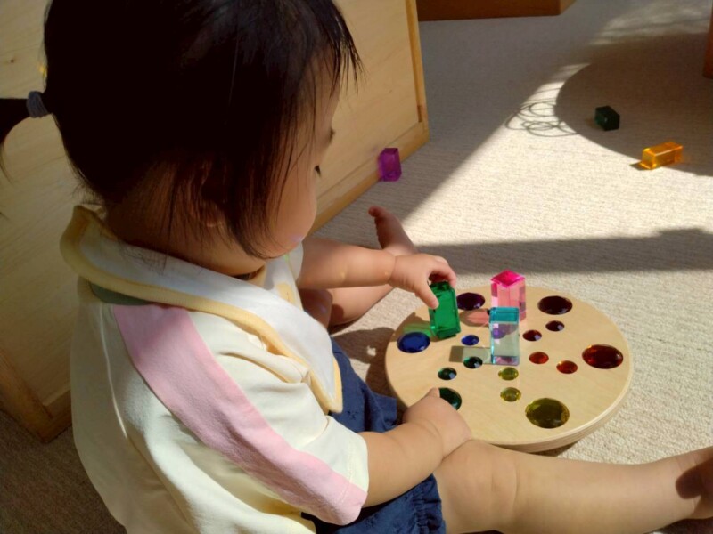 室内遊びでも窓から入る日差しの明るさに気づき、指を差して友達や保育士に教えたり、「なんだ?」と不思議がったりしています。ジュエル積み木やジュエルこまの輝き、床や壁、天井に映るカラフルな影や光にも気づいて興味津々の子ども達です。