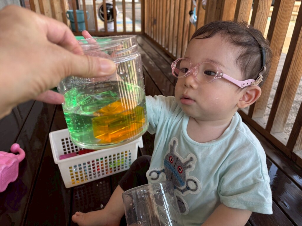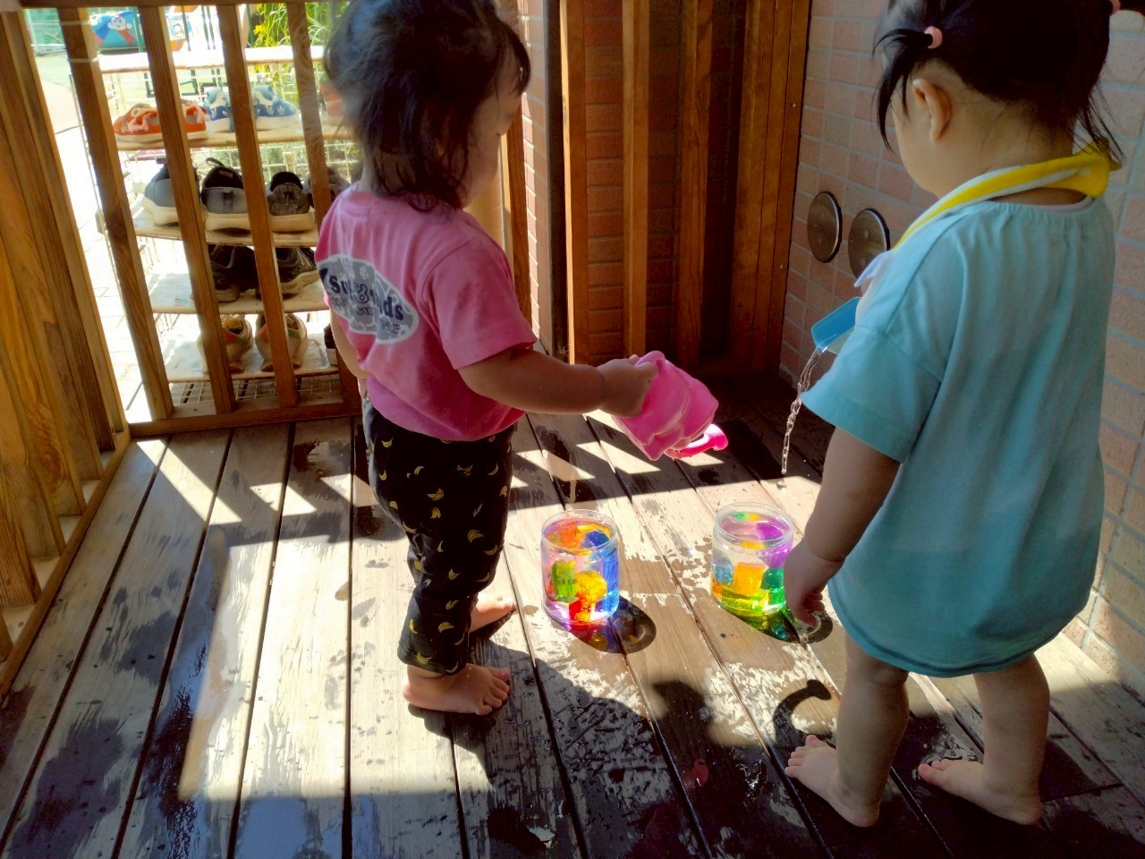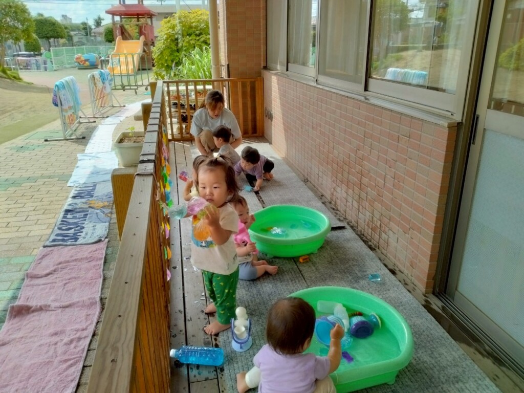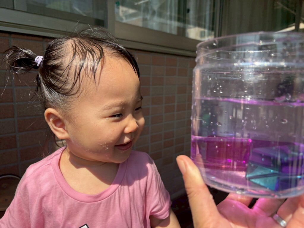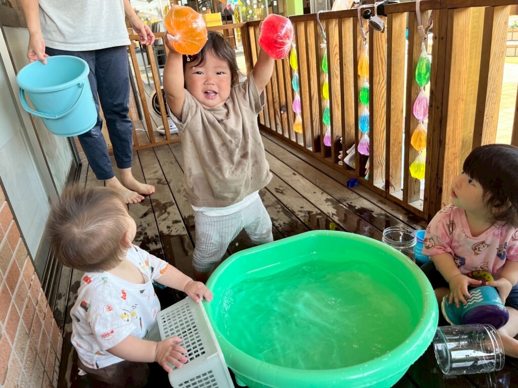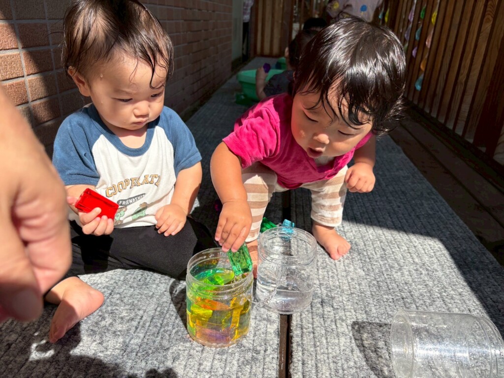 暑かった8月。水遊びをたくさん楽しみました。冷たい水の感触を楽しむだけではなく、水面が揺れる様子を見たり、日差しを受けたジュエル積み木のカラフルな影を見たりと水や光を感じる中で気づきや発見も楽しみました!