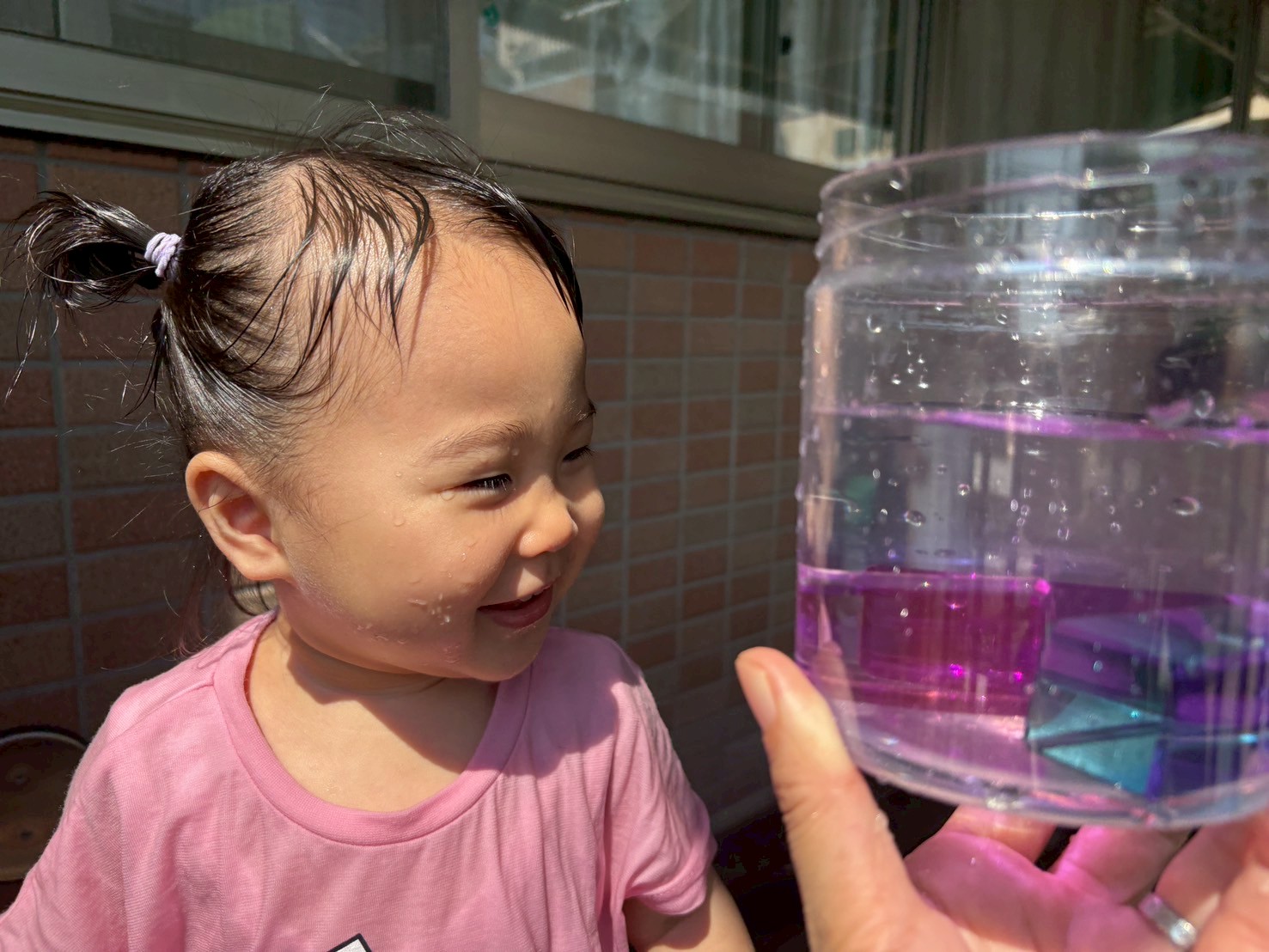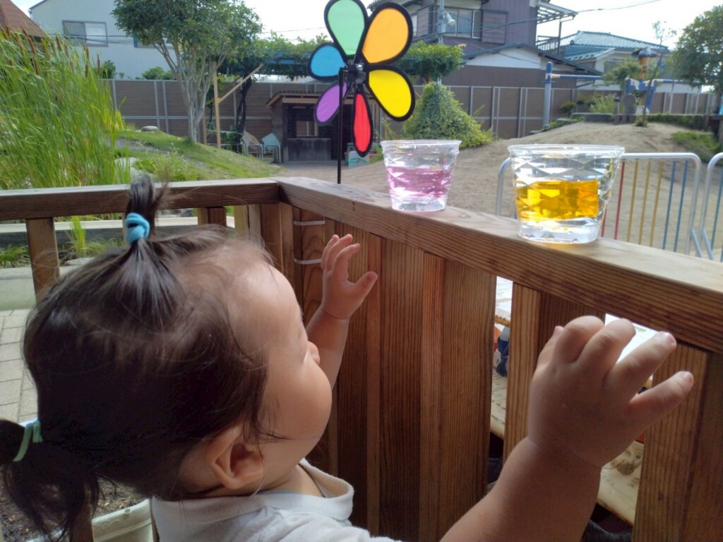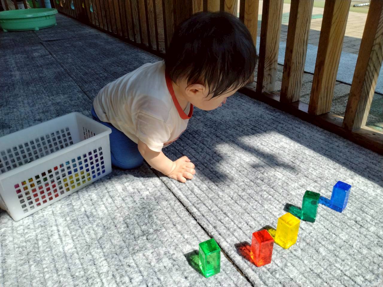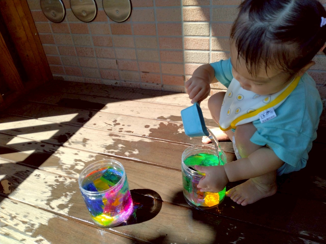 暑かった8月。水遊びをたくさん楽しみました。冷たい水の感触を楽しむだけではなく、水面が揺れる様子を見たり、日差しを受けたジュエル積み木のカラフルな影を見たりと水や光を感じる中で気づきや発見も楽しみました!