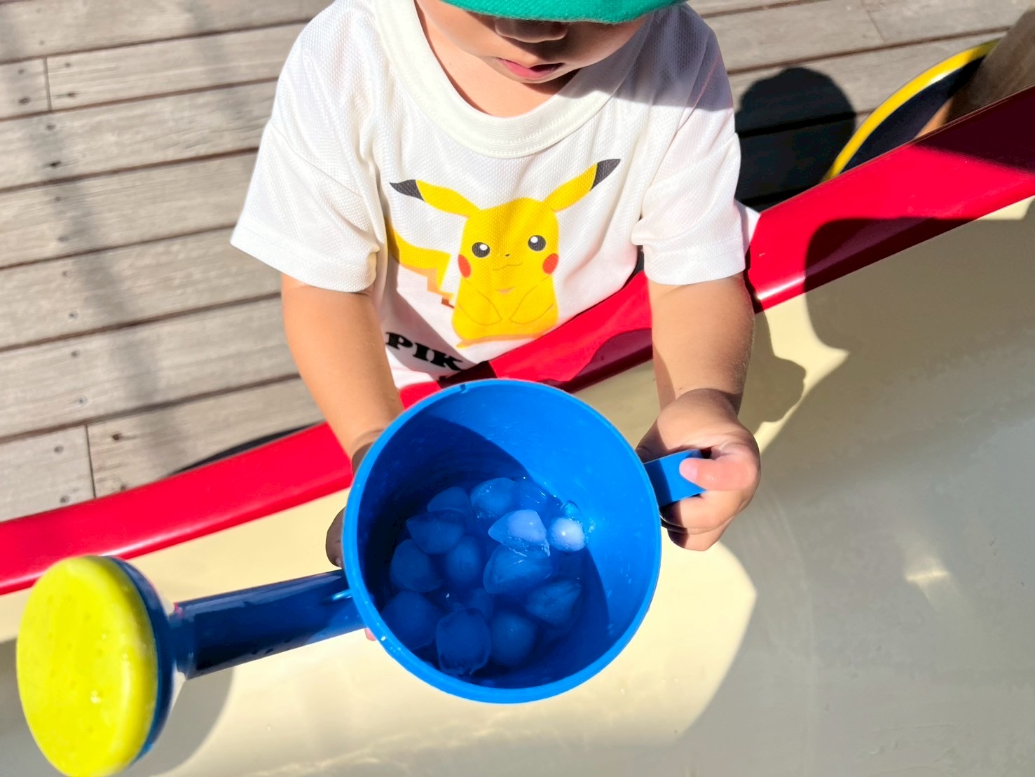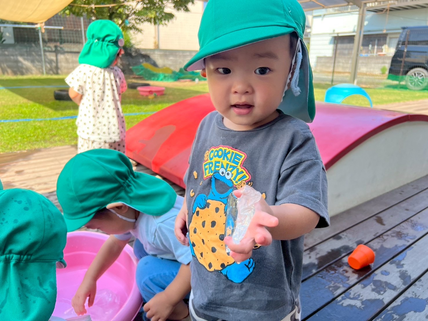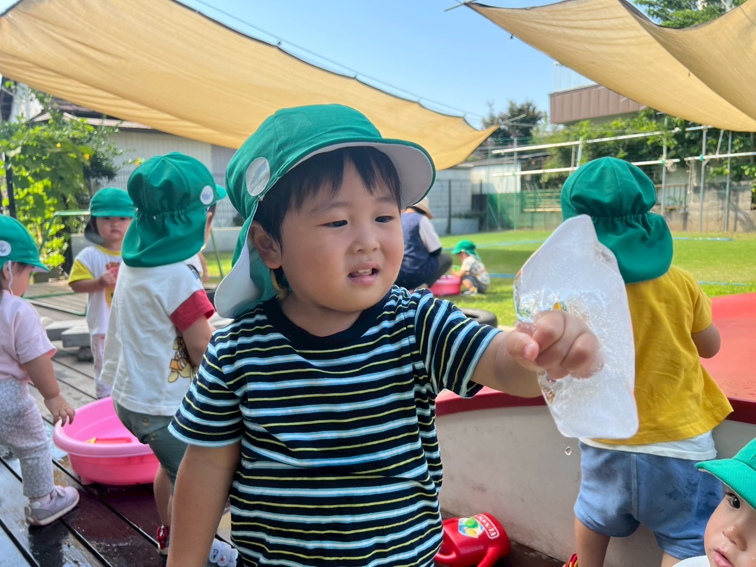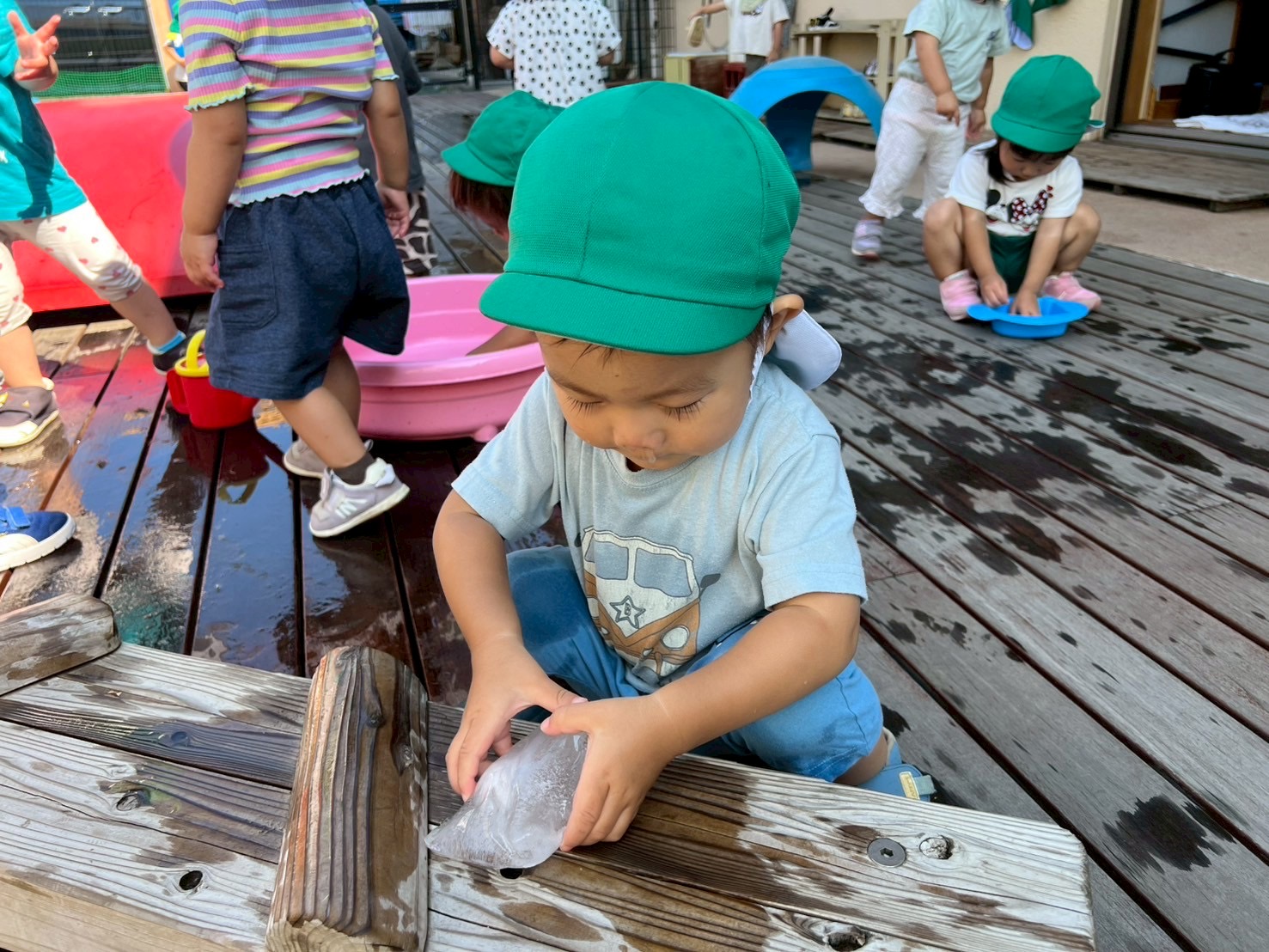 氷にも触れ、冷たさに驚いたり、体温や日差しが当たると溶けていく様子をじっくりと観察していました。