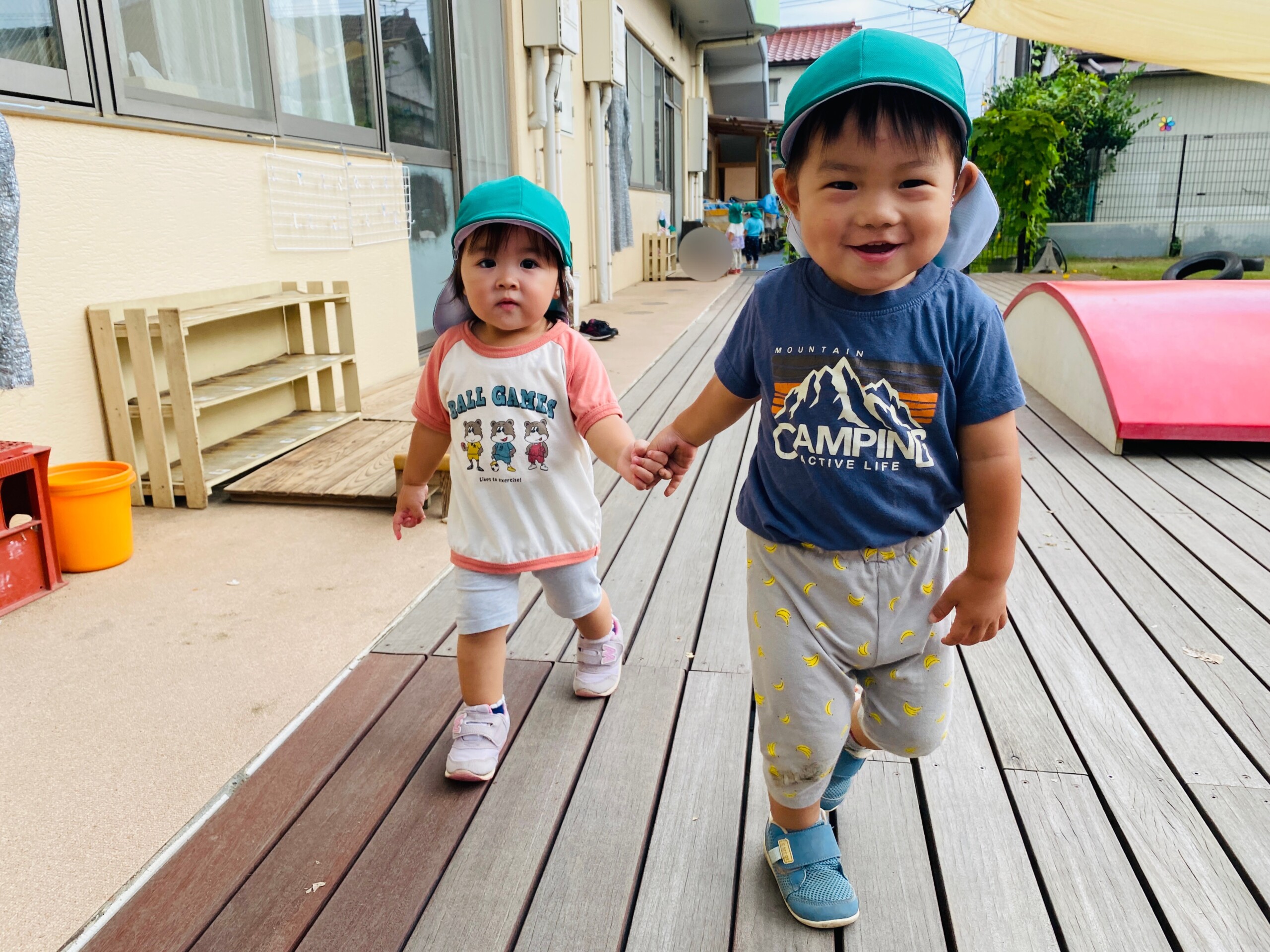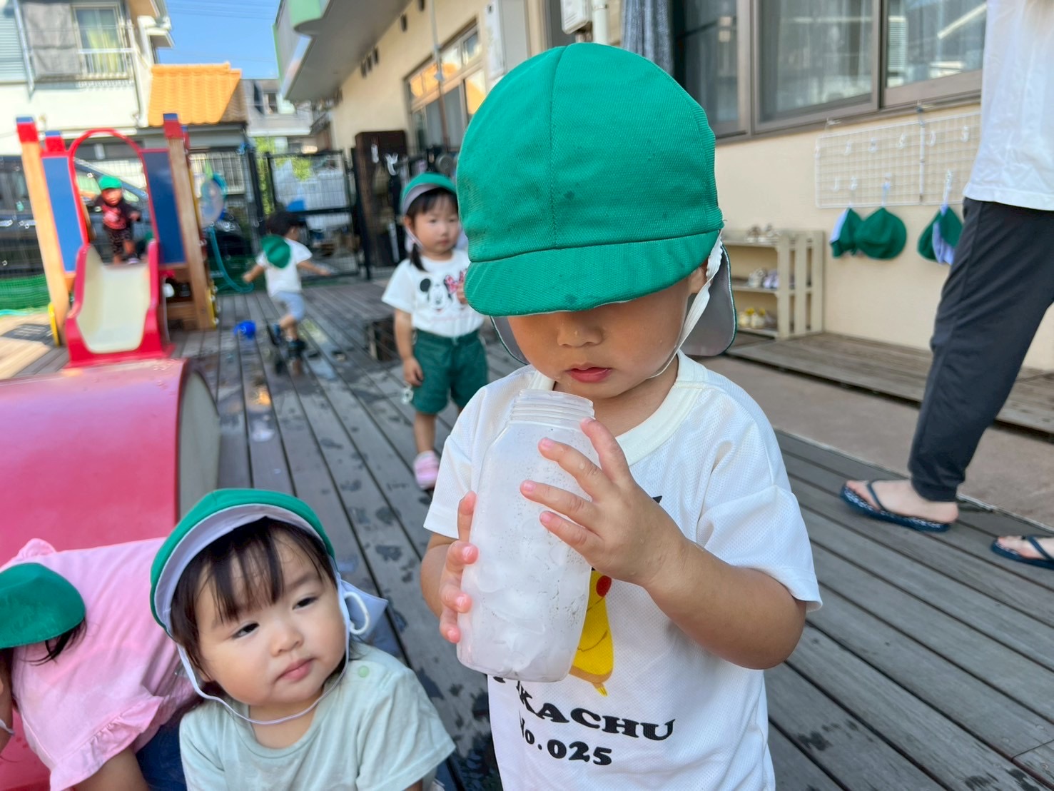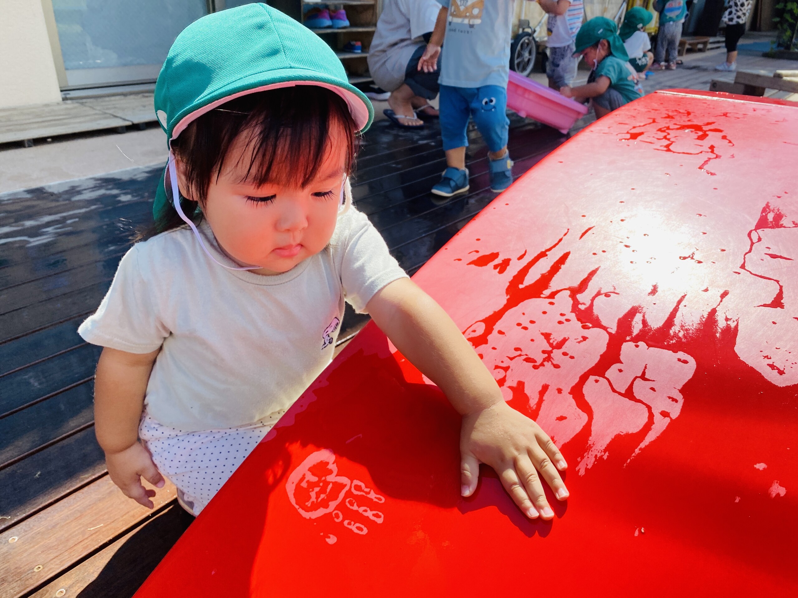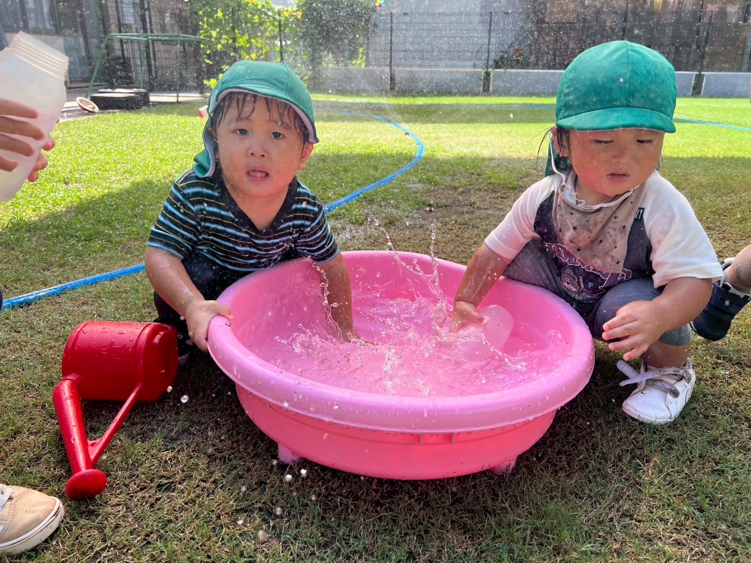 水にも慣れてきて、カップで水をすくってジョウロに入れたり、水が減ってくるとたらいを斜めにして、自分の足でたらいを支えながら水をすくう子もおり、驚きました‼