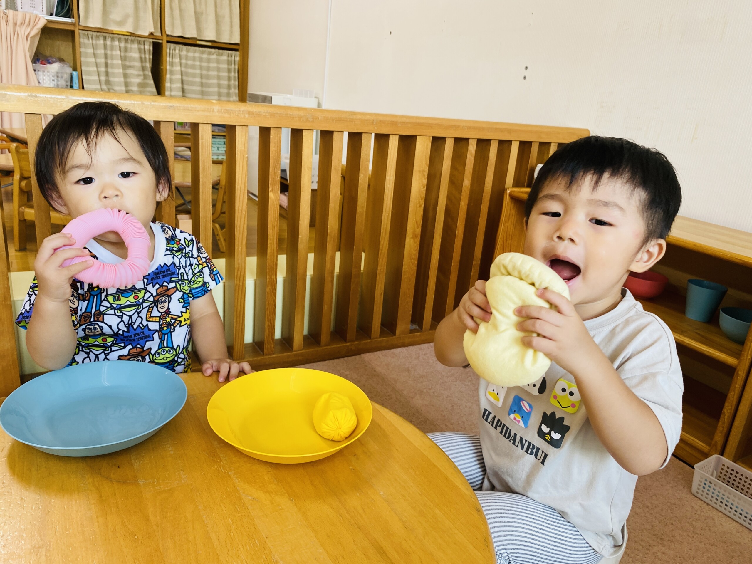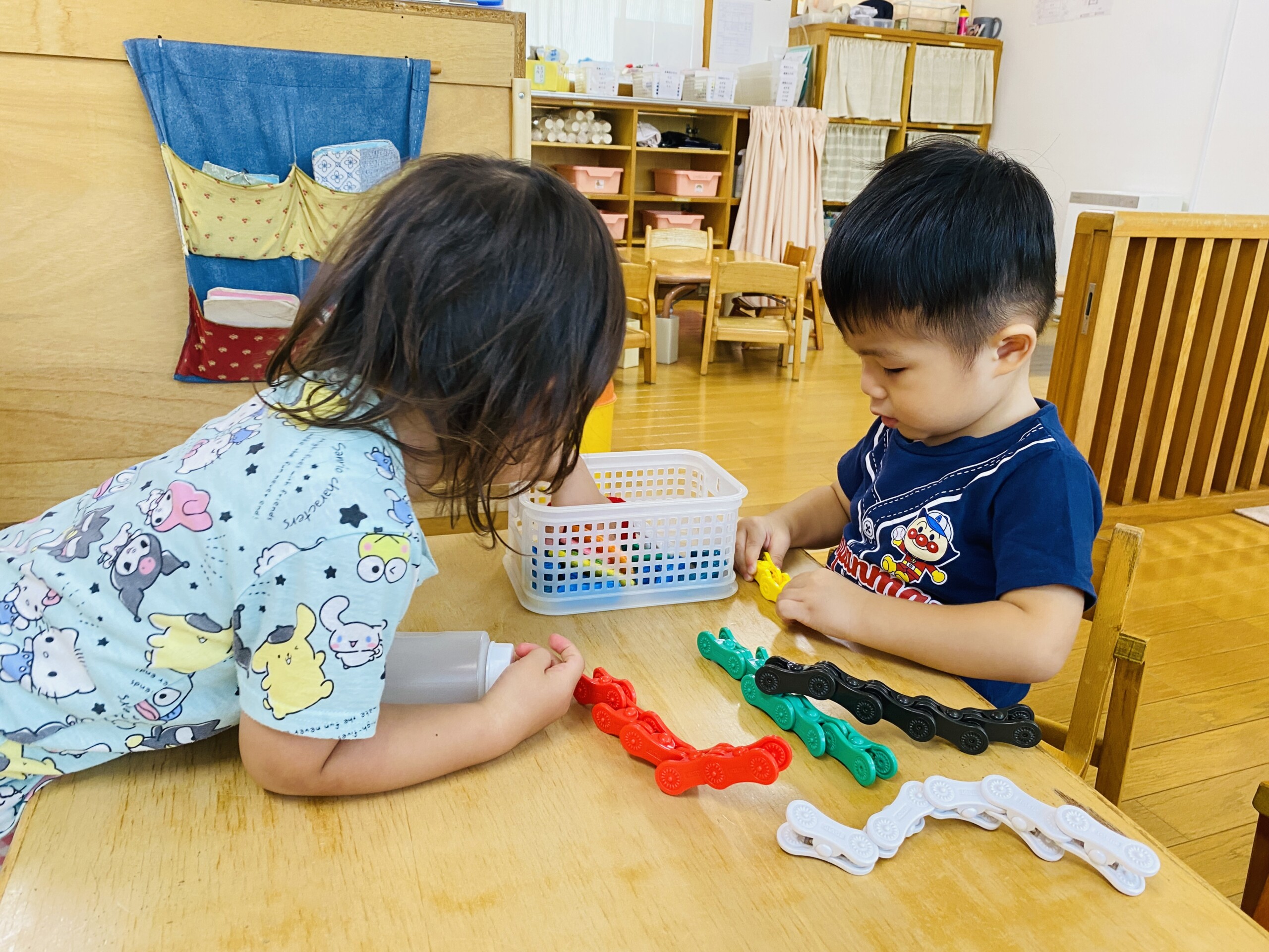 月初めに開催された青梅の花火大会で花火を知った子どもたちと、ロンディーで花火作りをしたり、おままごとでは、給食で食べたカレーとワカメスープに見立て、テーブルを囲んだりと、室内でも楽しく過ごしています。