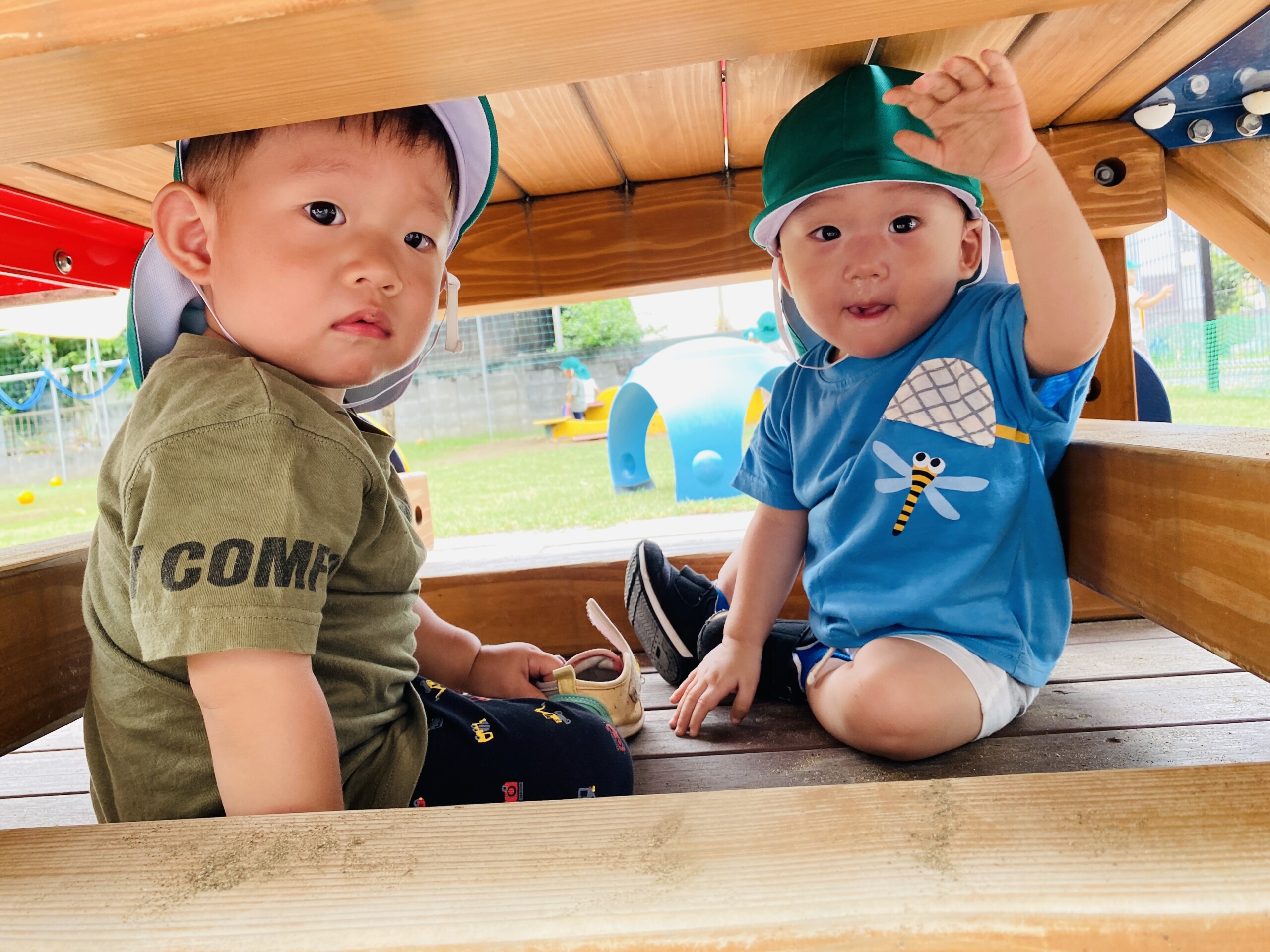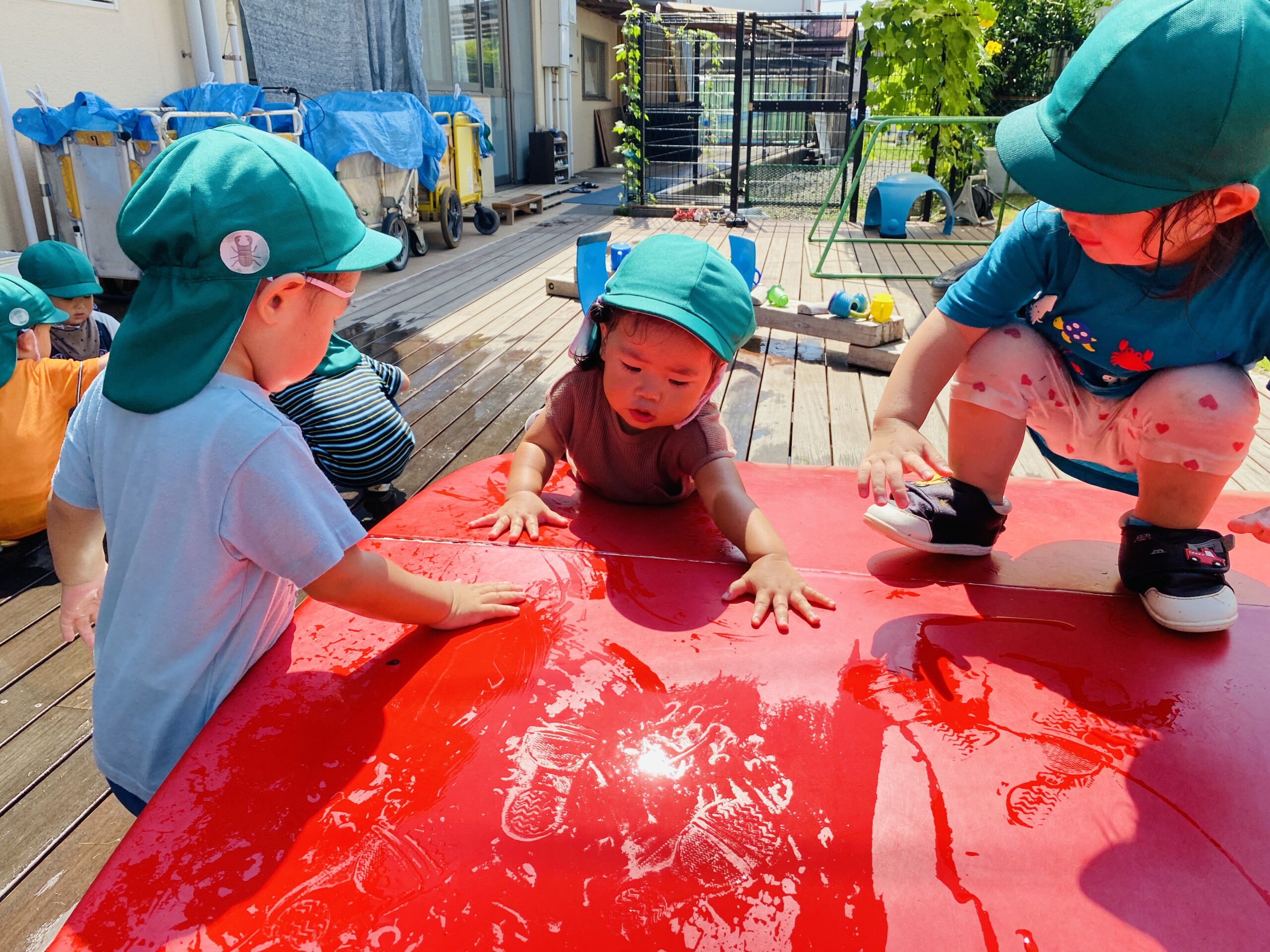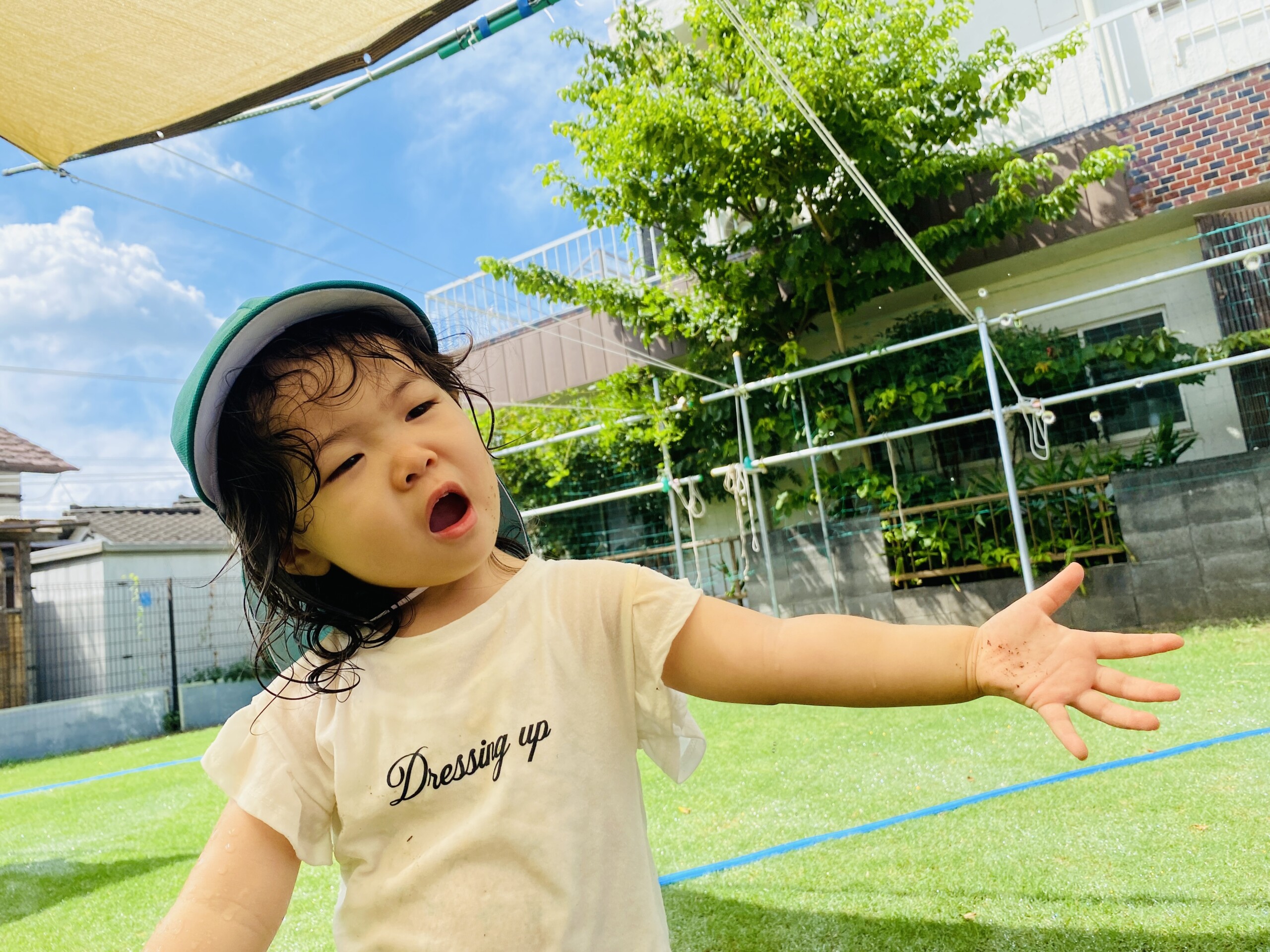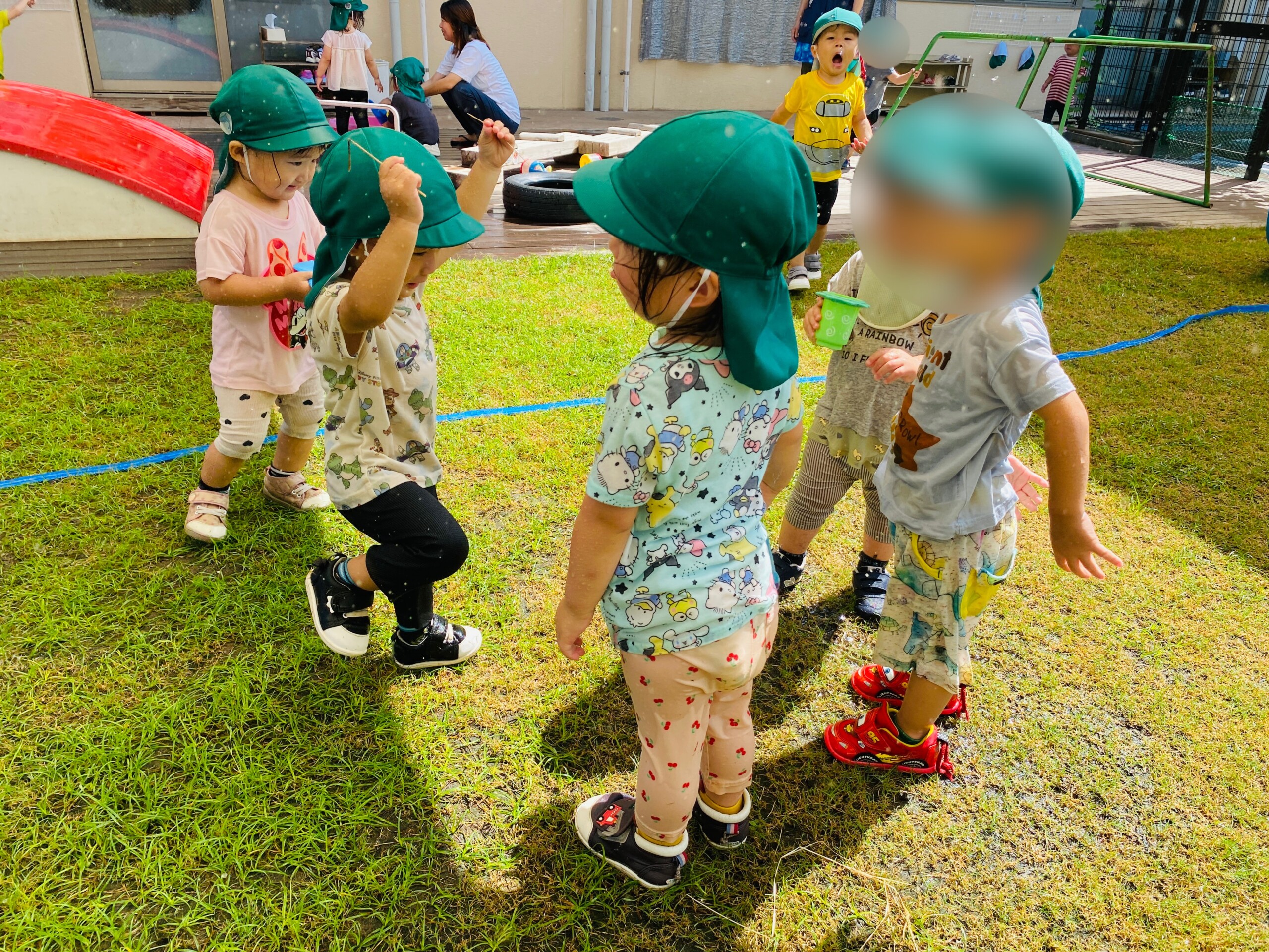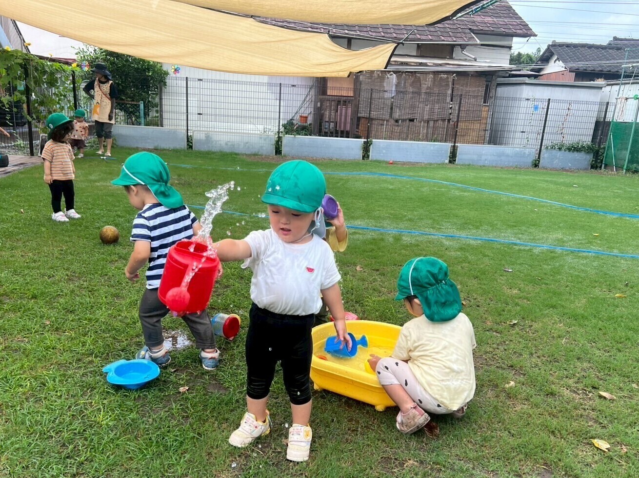 暑い日が続きますが、芝生広場に日除けのタープを張り、水遊びを行い楽しく過ごしています。