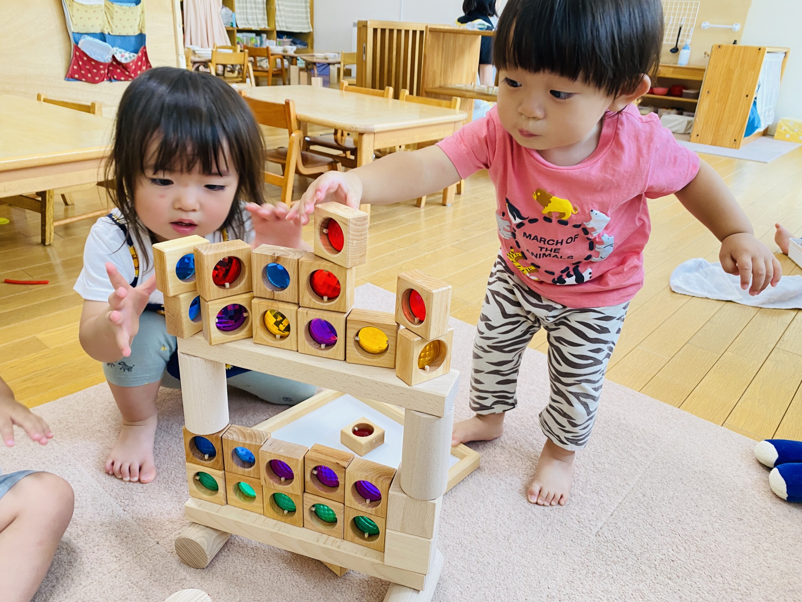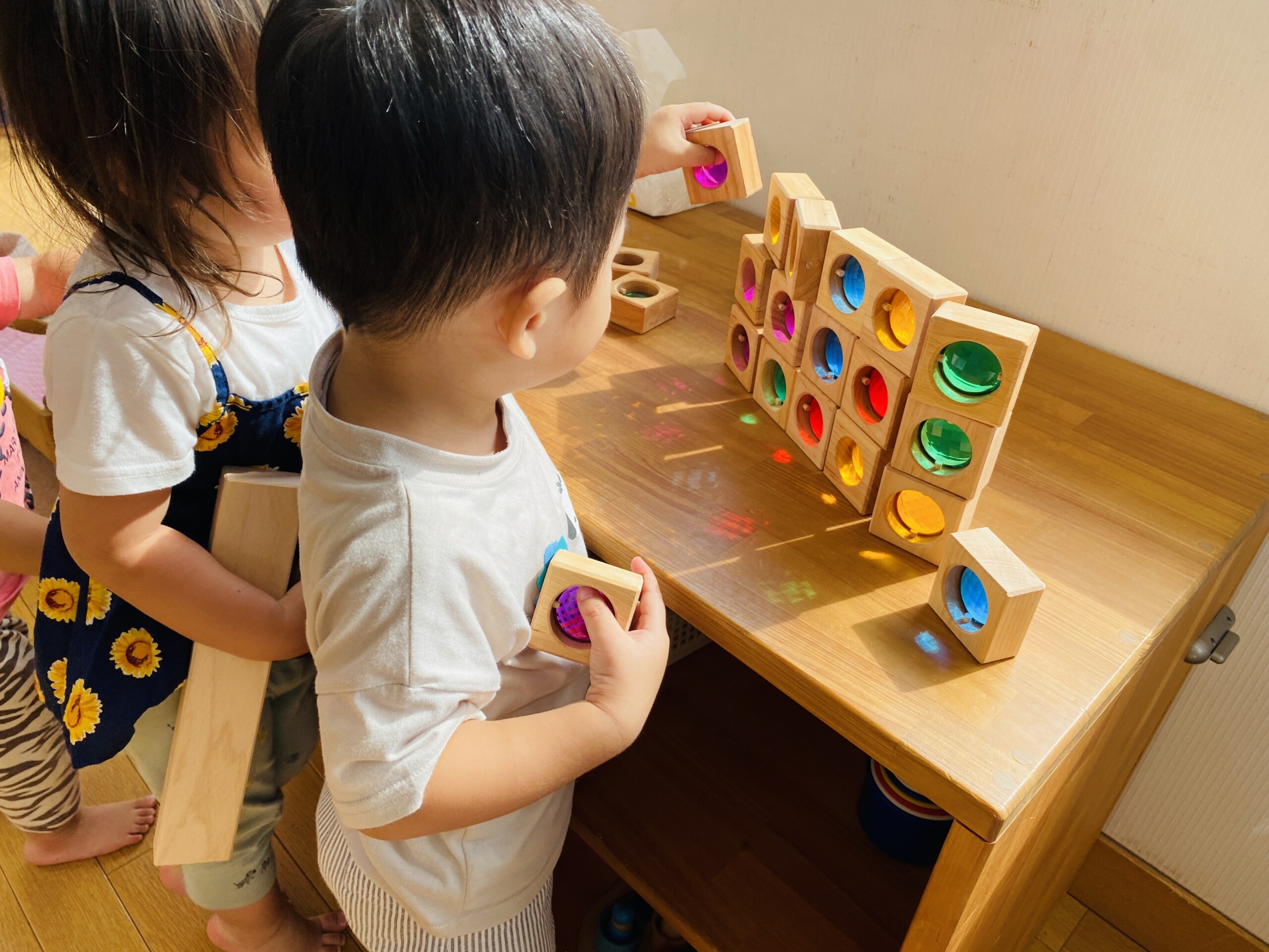 重ねたり、並べたり、覗いたりしながら色を楽しんでいます。