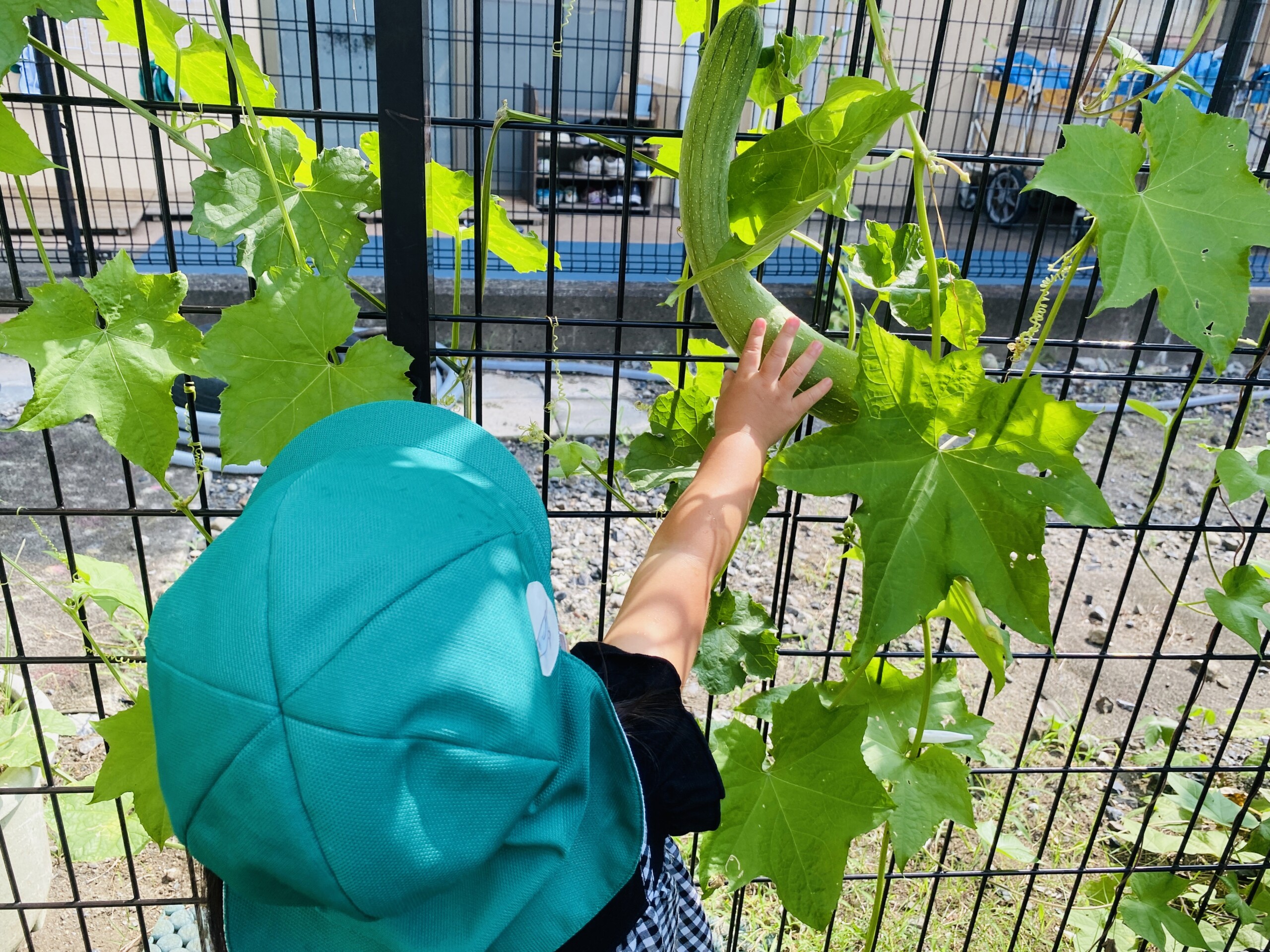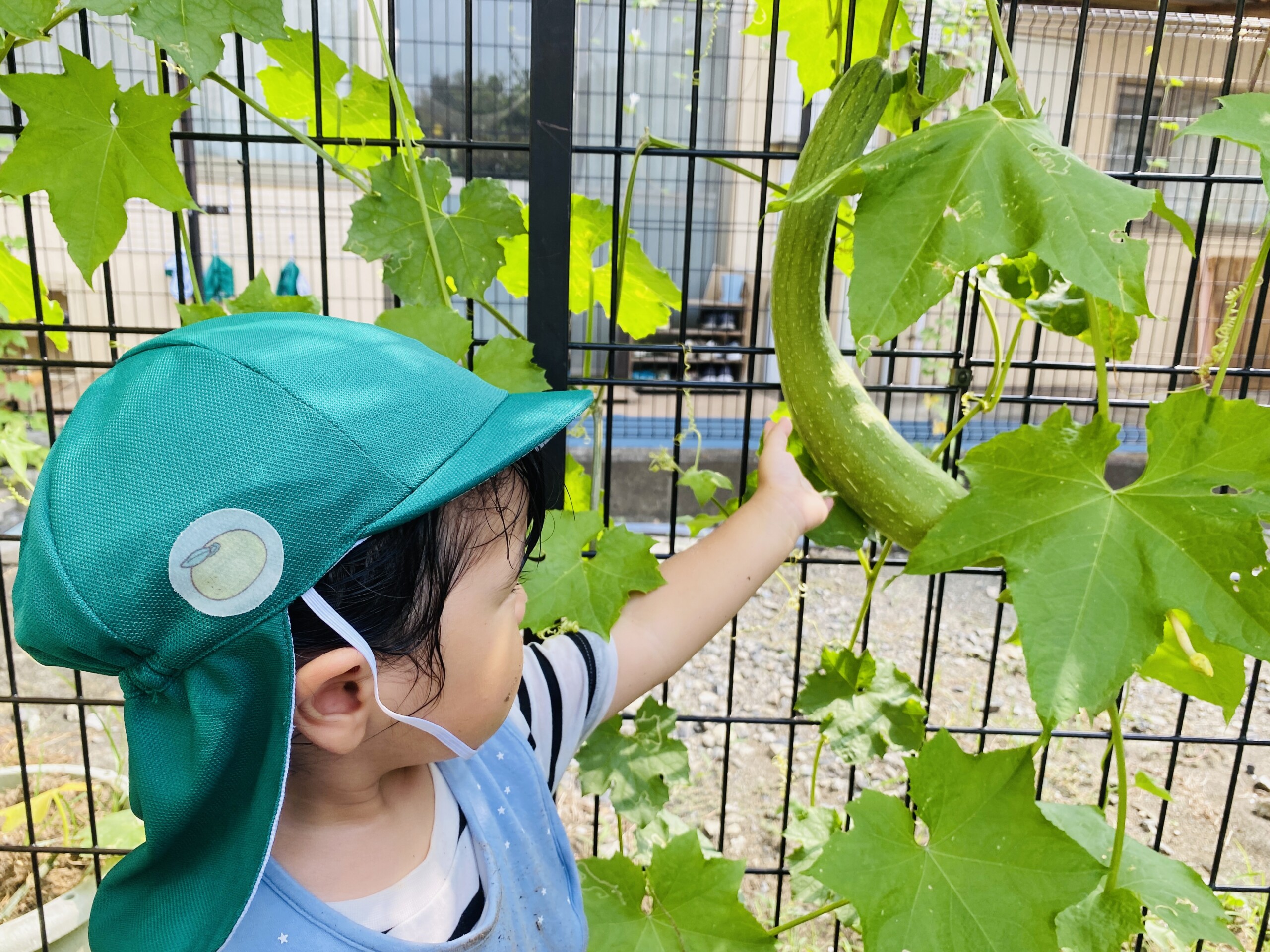 水やりをしながら生長を見守っていたヘチマが実ると、触れたり、においをかいでみたり。