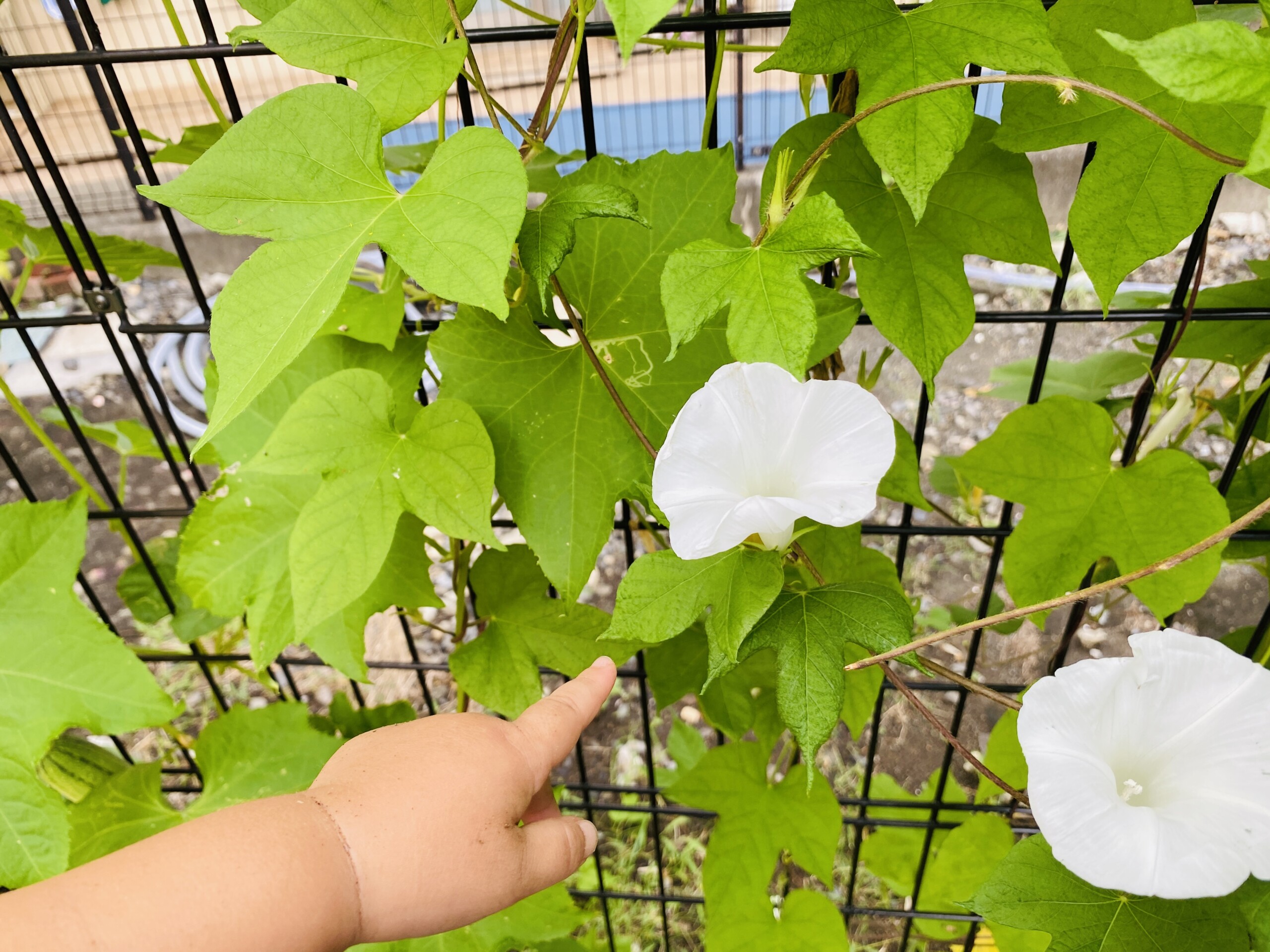 また、お隣の庭に咲いていた朝顔も発見し、顔を近付けて観察したり、落ちた花びらを集め嬉しそうにしていました。