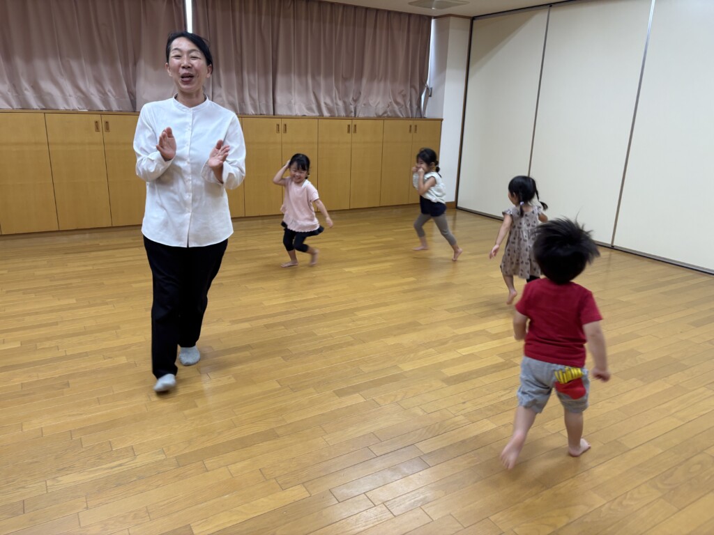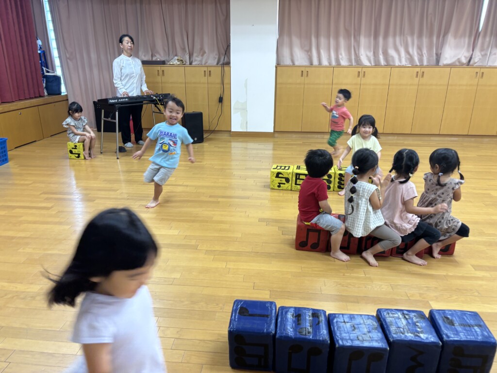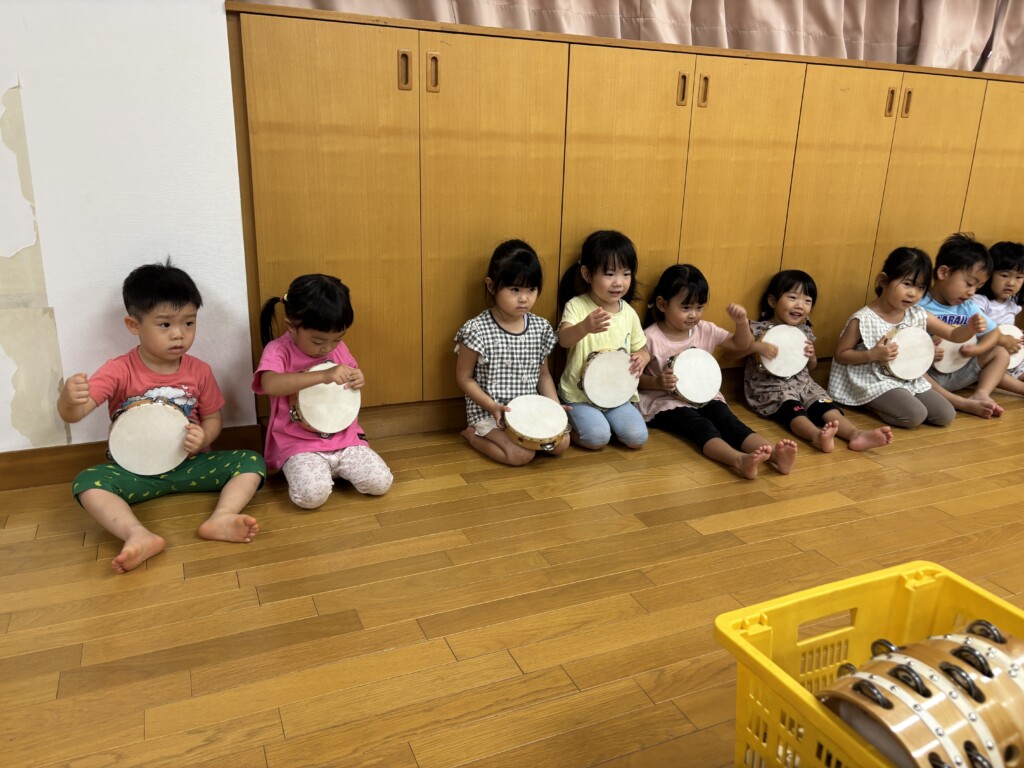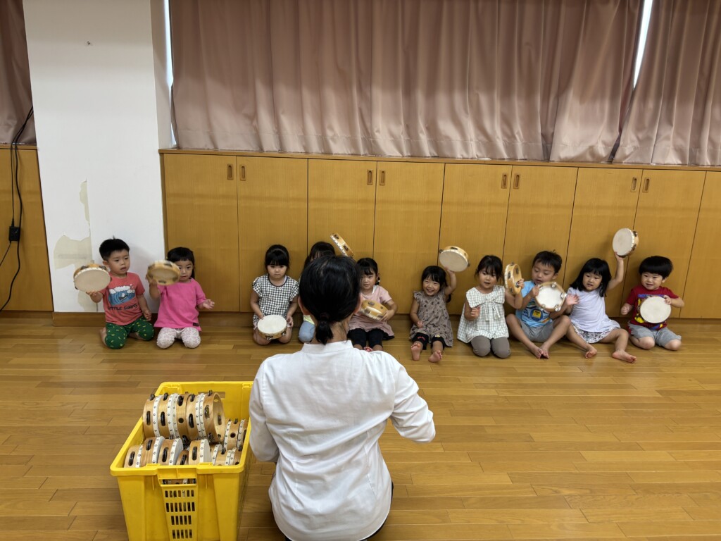 8月の間はお休みだった音楽リズムに参加しました。子どもたちは音楽リズムが大好きなので、始まるまでとても嬉しそうにウキウキしていました。講師の先生との挨拶も元気一杯で「おはようございます」「よろしくお願いします。」の声にも力が入っていました。「乗り物」「食べ物」「動物」の三つのグループから好きな物を選び、ピアノの音を聴きグループ毎に動いて楽しみました。自分のグループがいつ呼ばれるかどんな音が聴こえてくるのか、真剣な表情で参加していた子どもたちでした。次は、みんなでタンブリンを鳴らして楽しみました。講師の先生の言う通りに鳴らすとあっという間に合奏を楽しむ事ができました。「じょうずだねー」と褒めてもらうと子どもたちも嬉しくてニコニコしていました。楽器に触れる事はとても楽しいと思うひと時でした。