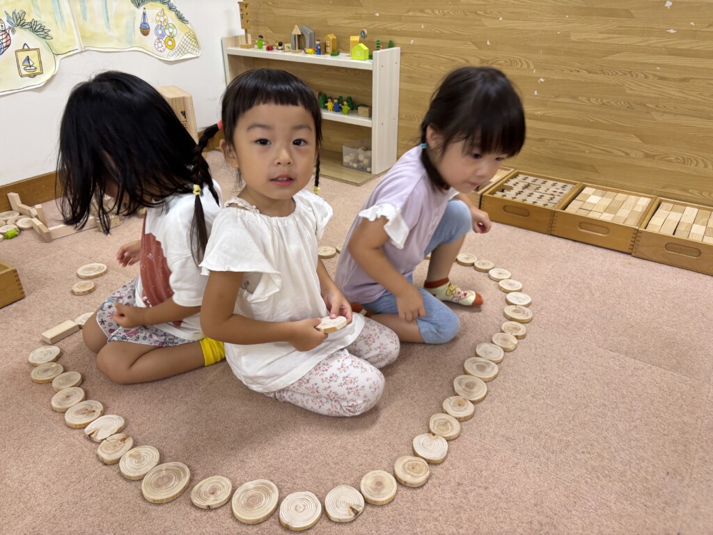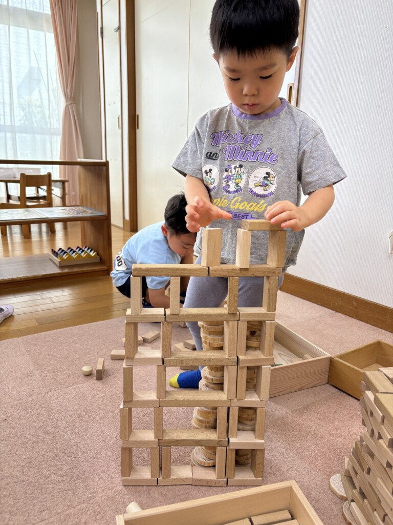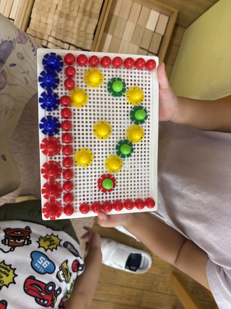 子どもたちが自ら考えて積み木を積み遊んだり、集まりの中で観ている絵本から遊びを広げ楽しんでいる事もあります。大人よりも想像力豊かな子どもたちは色々な物を作り、伝えてくれたり見せてくれたりしながら楽しく過ごしています。今月から「めっきらもっきらどぉんどん」の絵本を見始めています。妖怪が出てくるちょっと不思議なお話に興味津々の子どもたちは絵本の中に出てくる物をLaQやぬり絵等で表現して楽しんでいます。まだ始まったばかりなので今後どのような広がりを見せるか楽しみです。
