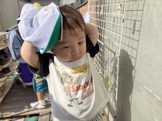 芝生へ行く支度もわかるようになり、マークを探して靴下や靴を持って履こうとしたり、自分で帽子を被ろうとする姿もみられて、