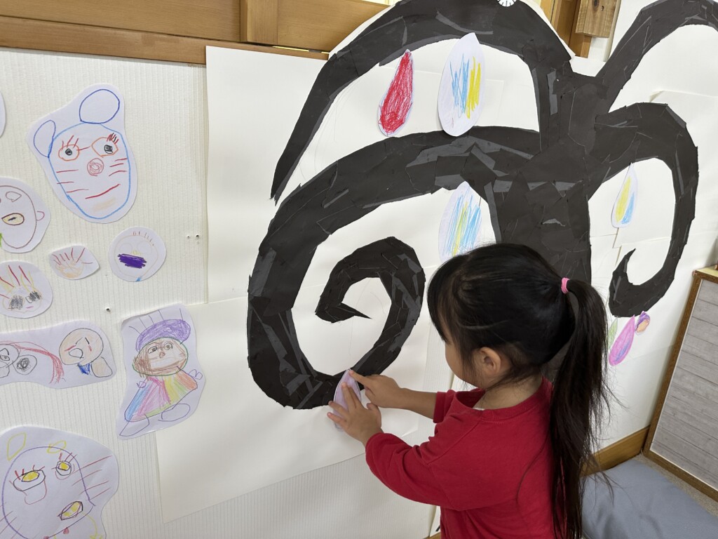 おもちのなる木に美味しそうなおもちがなりました♪「おいしそうだよね♪」「食べてみたいな~」「にじいろのおもちだよ」子どもたちの発想に私たちもわくわくしました!!