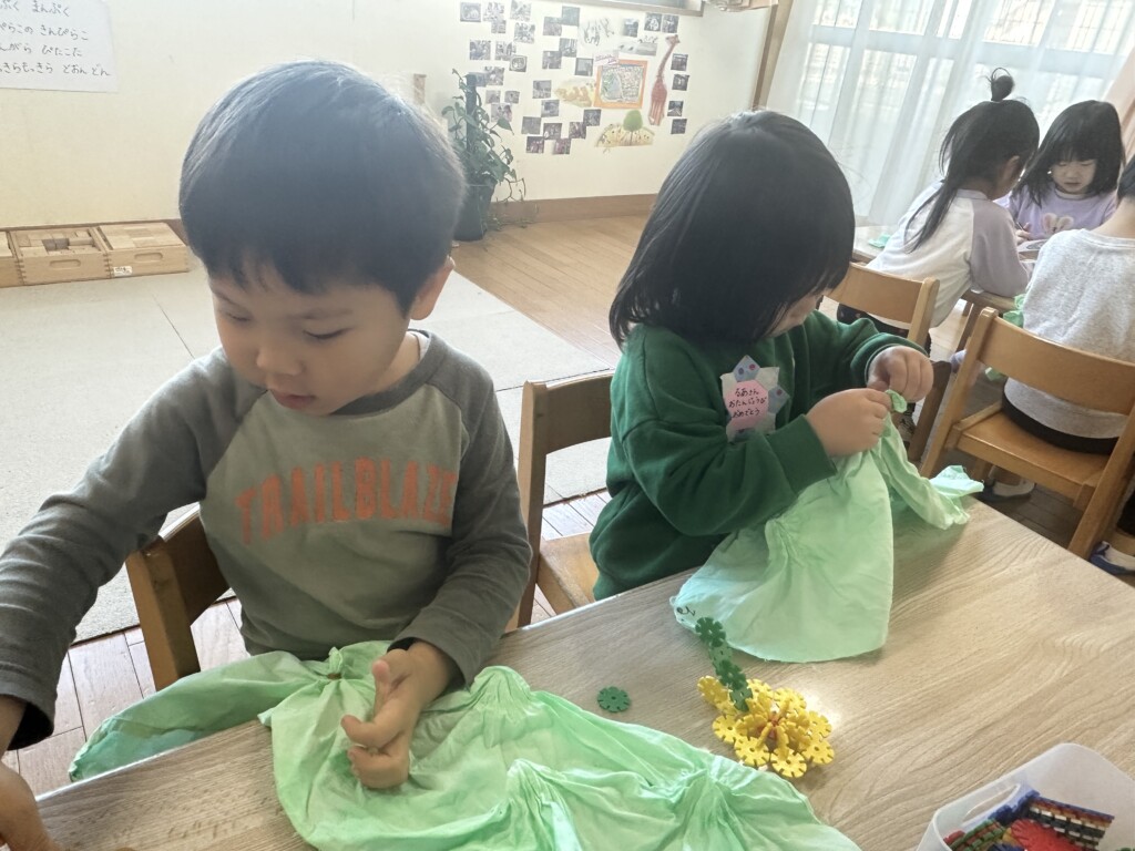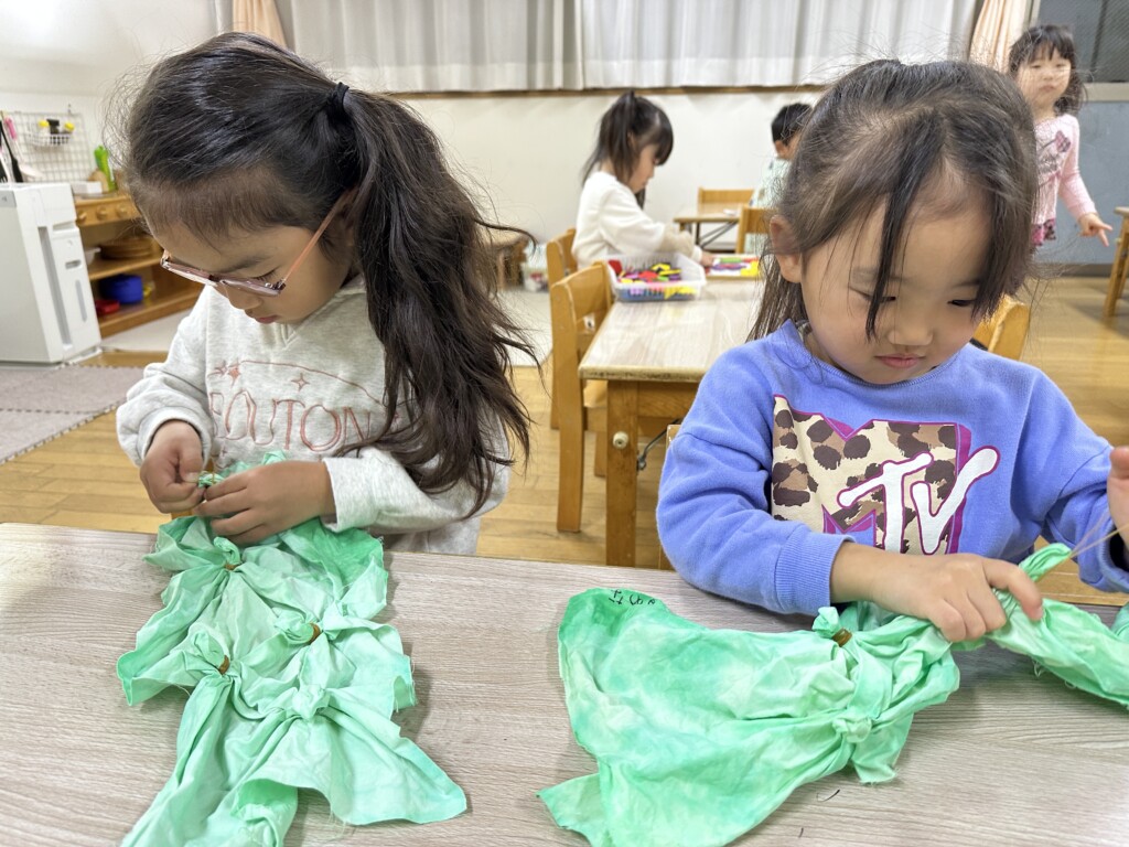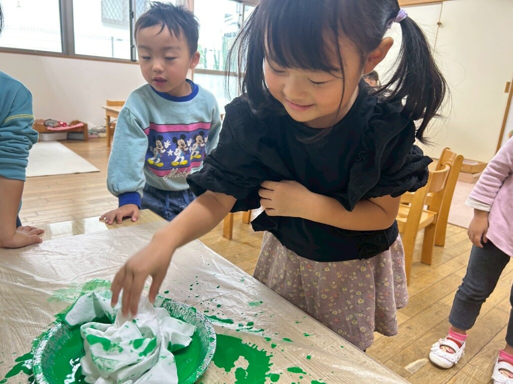 白い布を緑に染めるために、ダイタイ染めをしました。白い布が緑色のインクを吸い込み、じわじわとしみ込んでいく様子を楽しむ子どもたち♪「緑になってく!!」「きれい!!」「楽しい!!」子どもたちの楽しい気持ちが伝わってきて、私たちも楽しい時間となりました♪