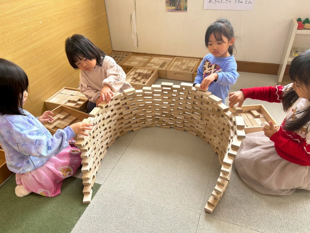 神社にある大きな木を積み木で作りました!!「私かんたね!」と、かんたになりきって大きな木のあなのなかへ♪「ちんぷくまんぷくあっぺらこのきんぴらこ・・・」呪文を唱えてみたけれど「あれ?落ちないや!」と、世界に入り込んで遊んでいて可愛らしかったです♡
