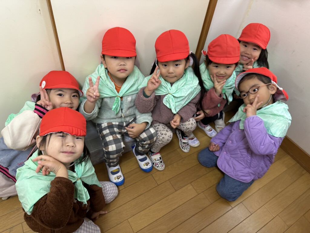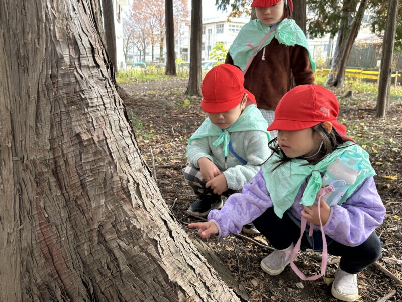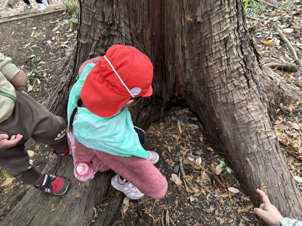 「かんたの場所だ!」「大きな木がある!」「穴があった!!」と到着するなり探検が始まりました!!「ねぇ!歌ったら来るんじゃない?」「歌ってみよう!」と呪文の歌を歌い出しました♪「ちんぷくまんぷくあっぺらこのきんぴらこじょんがらぴたこためっきらもっきらどおんどん!」皆んなで大合唱!「あれっ?!来ないな」賑やかだったからか、おばけたちは出て来ませんでしたが、子どもたちの心はめっきらもっきらどおんどんの絵本の世界で満たされていました!!絵本と共に過ごしたこの時間が素敵な思い出になり、絵本が大好きになってくれたらいいなと思います🎵