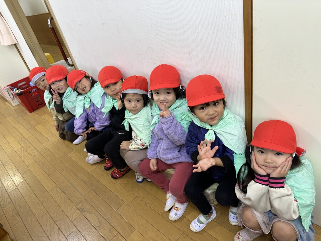 絵本の中の登場人物になりきって遊ぶ子の姿が多く見られるようになったので、もっと楽しい体験ができないかと思い、かんたが絵本の中で付けているマントを製作し、それを付けて神社の木を探しに散歩に出掛けることにしました♪