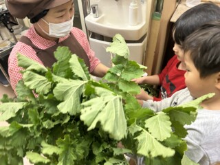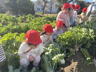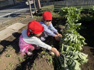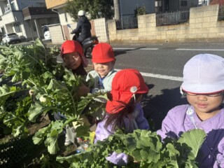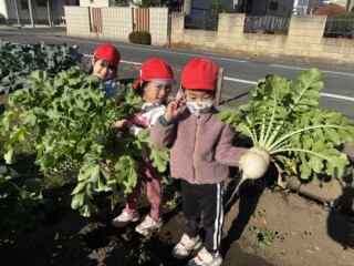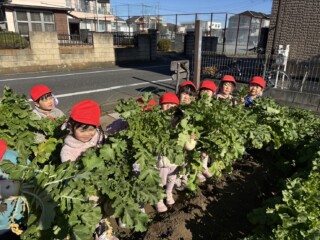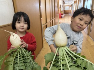 9月にぱんだ組で聖護院大根の種を撒き、用務の青木さんと一緒に手入れをした畑に立派な大根ができました。散歩に出掛けた時に畑に寄り「早く大きくならないかなあ・・」と言いながら心待ちにしていた子どもたちです。部屋でいつも見ている「おおきなかぶ」の絵本のように「うんとこしょ、どっこいしょ」と言いながら大根を抜いてきました。葉っぱも大きく成長していて子どもたちも大喜び!「大根いっぱい取れたね」と言い満足そうにしていました。
