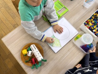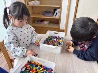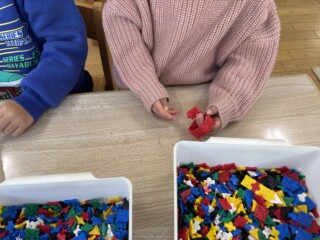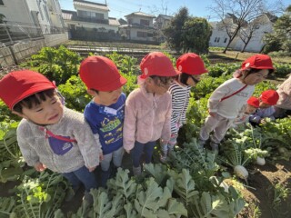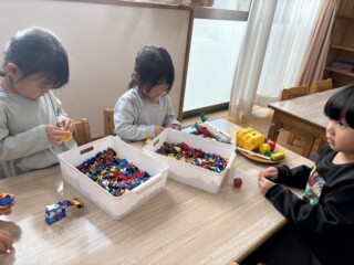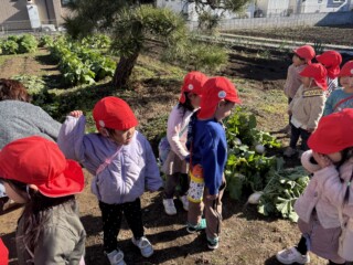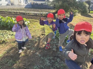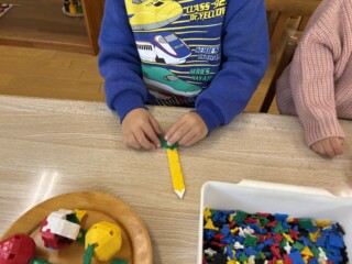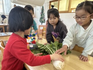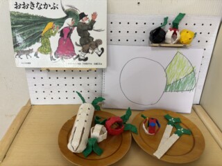 大根の収穫が印象に残ったのと、「おおきなかぶ」の絵本から遊びが広がりLaQで大根や野菜を作ったり、大根の絵を描き楽しんでいる子もいました。「何作ってるの?」と興味津々で尋ねている子もいました。「一緒に大根作ろうよ」と保育士を誘い遊びを楽しんでいる子どもたちもいて、冬野菜を身近に感じる良い経験になりました。