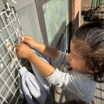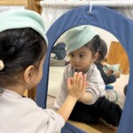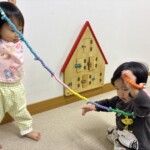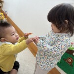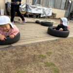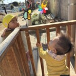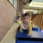 坂道をはいはいやつかまり立ちで移動して沢山動かしています。他のクラスの子が声を掛けたり、風車を回してくれたりと関わりが多くみられました。