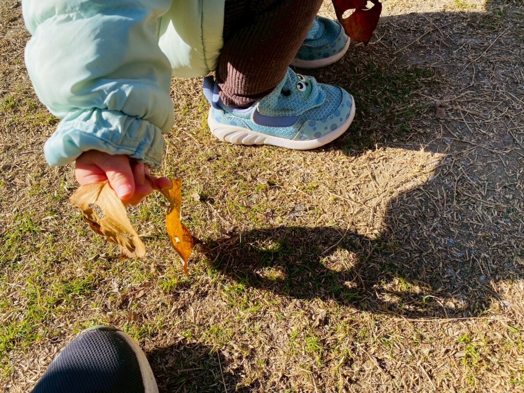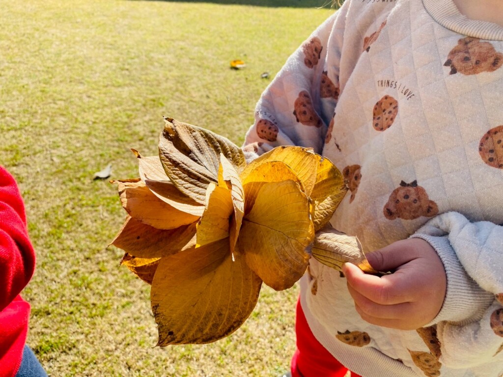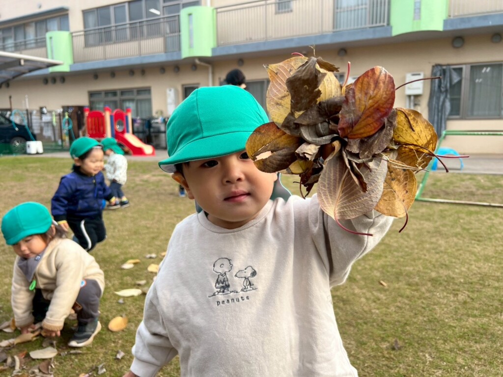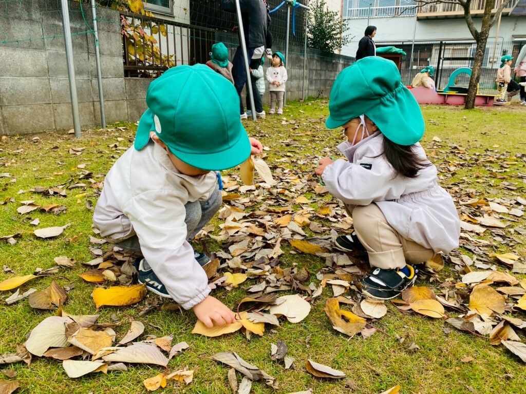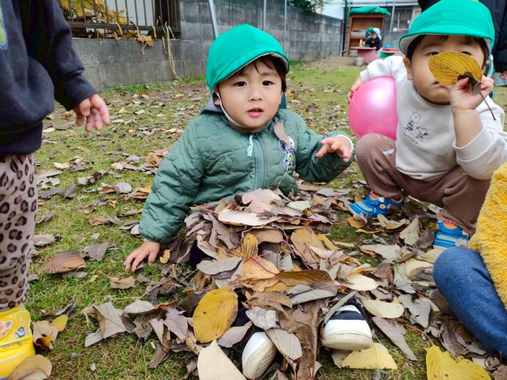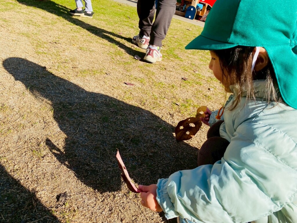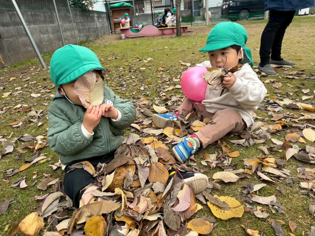 落ち葉遊びが好きな子どもたち。芝生広場に出ると落ち葉を手に取り「あったよ!」と嬉しそうでした。落ち葉を拾うだけでなくちぎって音を楽しんだり、袋に落ち葉を集めて「せーの!」の声に合わせて袋の中からたくさんの落ち葉が降ってくると大喜びです。